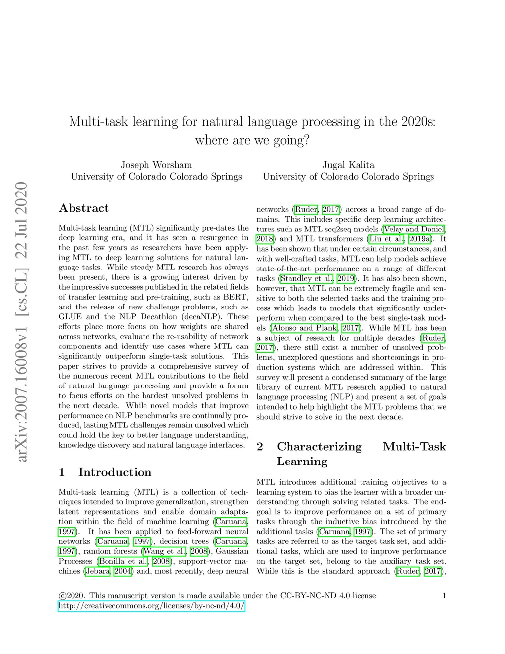 Multi-task learning (MTL) significantly pre-dates the deep learning era, and it has seen a resurgence in the past few years as researchers have been applying MTL to deep learning solutions for natural language tasks. While steady MTL research has always been present, there is a growing interest driven by the impressive successes published in the related fields of transfer learning and pre-training, such as BERT, and the release of new challenge problems, such as GLUE and the NLP Decathlon (decaNLP). These efforts place more focus on how weights are shared across networks, evaluate the re-usability of network components and identify use cases where MTL can significantly outperform single-task solutions. This paper strives to provide a comprehensive survey of the numerous recent MTL contributions to the field of natural language processing and provide a forum to focus efforts on the hardest unsolved problems in the next decade. While novel models that improve performance on NLP benchmarks are continually produced, lasting MTL challenges remain unsolved which could hold the key to better language understanding, knowledge discovery and natural language interfaces.