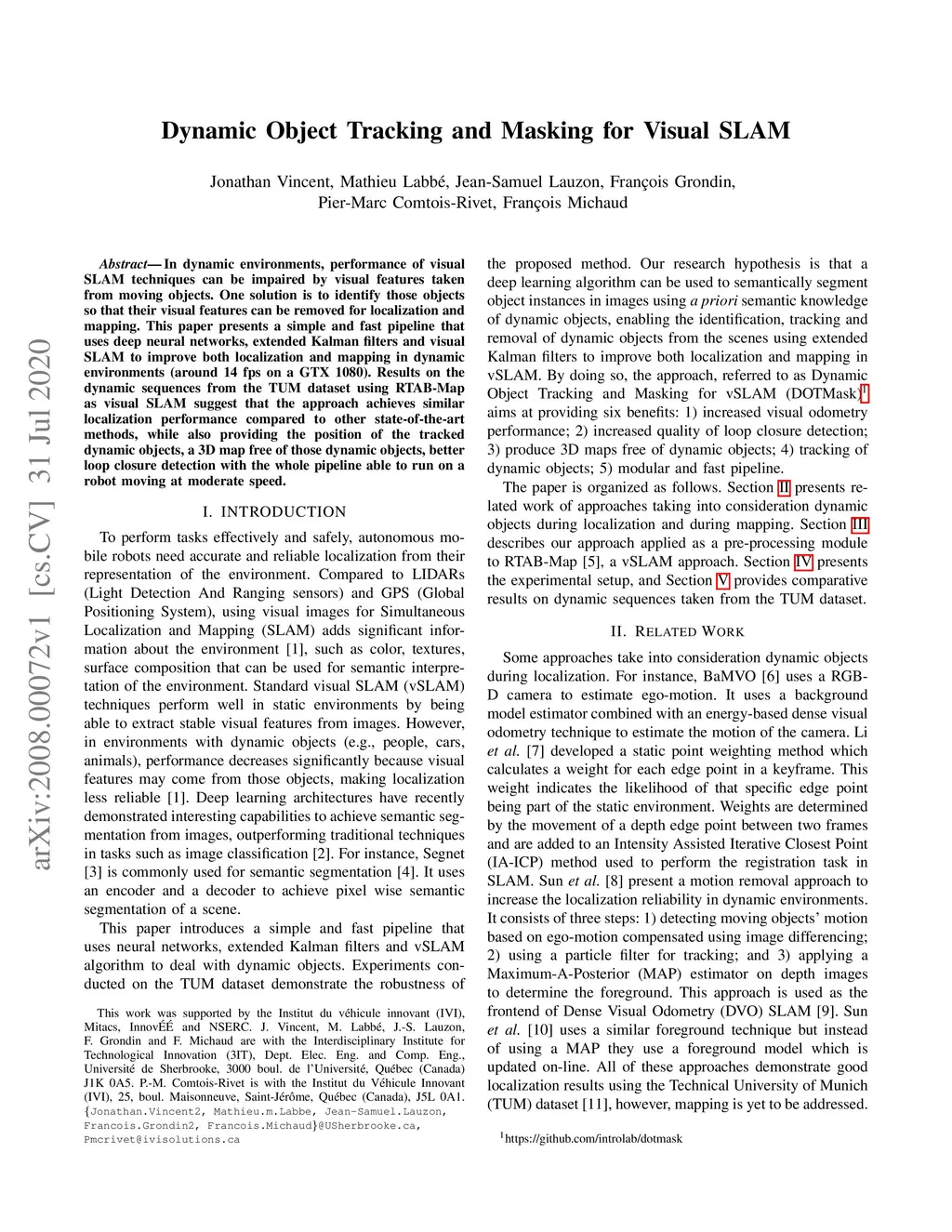 In dynamic environments, performance of visual SLAM techniques can be impaired by visual features taken from moving objects. One solution is to identify those objects so that their visual features can be removed for localization and mapping. This paper presents a simple and fast pipeline that uses deep neural networks, extended Kalman filters and visual SLAM to improve both localization and mapping in dynamic environments (around 14 fps on a GTX 1080). Results on the dynamic sequences from the TUM dataset using RTAB-Map as visual SLAM suggest that the approach achieves similar localization performance compared to other state-of-the-art methods, while also providing the position of the tracked dynamic objects, a 3D map free of those dynamic objects, better loop closure detection with the whole pipeline able to run on a robot moving at moderate speed.