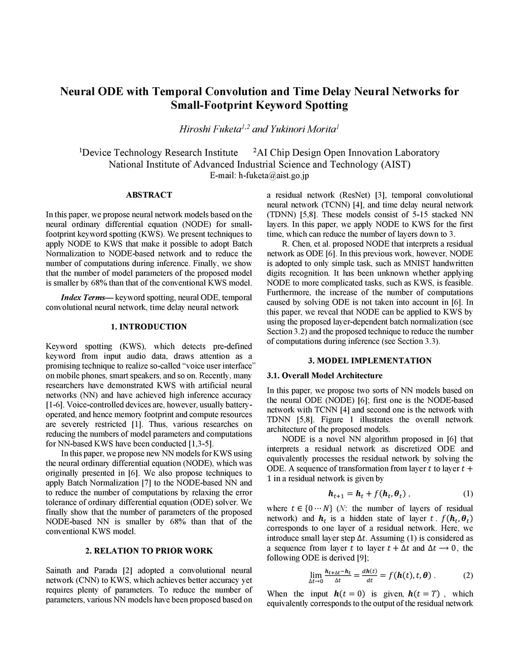 In this paper, we propose neural network models based on the neural ordinary differential equation (NODE) for small-footprint keyword spotting (KWS). We present techniques to apply NODE to KWS that make it possible to adopt Batch Normalization to NODE-based network and to reduce the number of computations during inference. Finally, we show that the number of model parameters of the proposed model is smaller by 68% than that of the conventional KWS model.