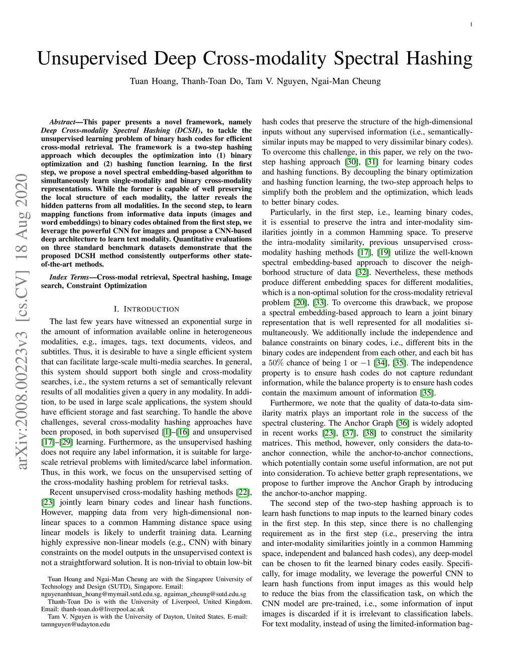 This paper presents a novel framework, namely Deep Cross-modality Spectral Hashing (DCSH), to tackle the unsupervised learning problem of binary hash codes for efficient cross-modal retrieval. The framework is a two-step hashing approach which decouples the optimization into (1) binary optimization and (2) hashing function learning. In the first step, we propose a novel spectral embedding-based algorithm to simultaneously learn single-modality and binary cross-modality representations. While the former is capable of well preserving the local structure of each modality, the latter reveals the hidden patterns from all modalities. In the second step, to learn mapping functions from informative data inputs (images and word embeddings) to binary codes obtained from the first step, we leverage the powerful CNN for images and propose a CNN-based deep architecture to learn text modality. Quantitative evaluations on three standard benchmark datasets demonstrate that the proposed DCSH method consistently outperforms other state-of-the-art methods.