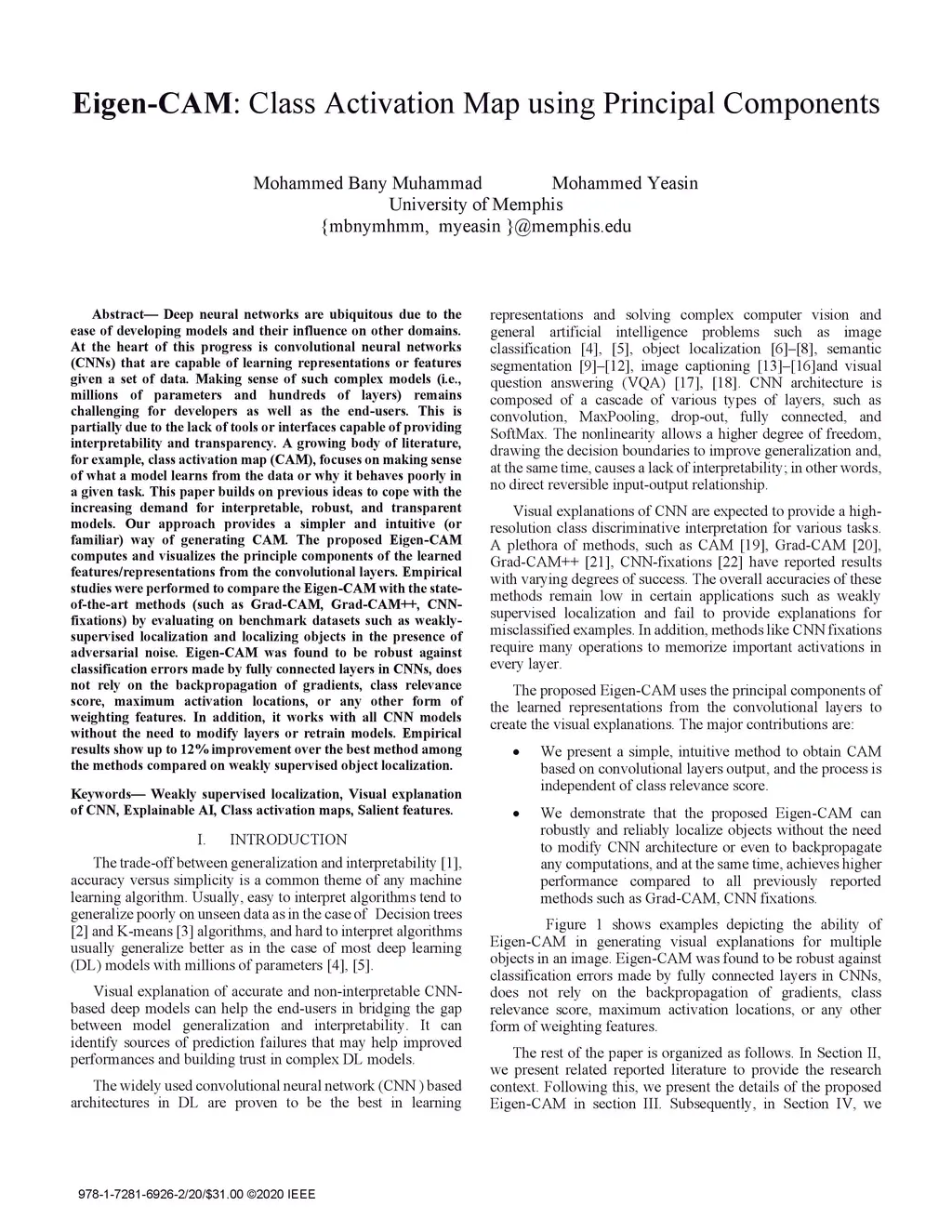 Deep neural networks are ubiquitous due to the ease of developing models and their influence on other domains. At the heart of this progress is convolutional neural networks (CNNs) that are capable of learning representations or features given a set of data. Making sense of such complex models (i.e., millions of parameters and hundreds of layers) remains challenging for developers as well as the end-users. This is partially due to the lack of tools or interfaces capable of providing interpretability and transparency. A growing body of literature, for example, class activation map (CAM), focuses on making sense of what a model learns from the data or why it behaves poorly in a given task. This paper builds on previous ideas to cope with the increasing demand for interpretable, robust, and transparent models. Our approach provides a simpler and intuitive (or familiar) way of generating CAM. The proposed Eigen-CAM computes and visualizes the principle components of the learned features/representations from the convolutional layers. Empirical studies were performed to compare the Eigen-CAM with the state-of-the-art methods (such as Grad-CAM, Grad-CAM++, CNN-fixations) by evaluating on benchmark datasets such as weakly-supervised localization and localizing objects in the presence of adversarial noise. Eigen-CAM was found to be robust against classification errors made by fully connected layers in CNNs, does not rely on the backpropagation of gradients, class relevance score, maximum activation locations, or any other form of weighting features. In addition, it works with all CNN models without the need to modify layers or retrain models. Empirical results show up to 12% improvement over the best method among the methods compared on weakly supervised object localization.