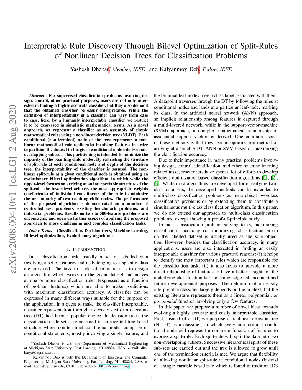 For supervised classification problems involving design, control, other practical purposes, users are not only interested in finding a highly accurate classifier, but they also demand that the obtained classifier be easily interpretable. While the definition of interpretability of a classifier can vary from case to case, here, by a humanly interpretable classifier we restrict it to be expressed in simplistic mathematical terms. As a novel approach, we represent a classifier as an assembly of simple mathematical rules using a non-linear decision tree (NLDT). Each conditional (non-terminal) node of the tree represents a non-linear mathematical rule (split-rule) involving features in order to partition the dataset in the given conditional node into two non-overlapping subsets. This partitioning is intended to minimize the impurity of the resulting child nodes. By restricting the structure of split-rule at each conditional node and depth of the decision tree, the interpretability of the classifier is assured. The non-linear split-rule at a given conditional node is obtained using an evolutionary bilevel optimization algorithm, in which while the upper-level focuses on arriving at an interpretable structure of the split-rule, the lower-level achieves the most appropriate weights (coefficients) of individual constituents of the rule to minimize the net impurity of two resulting child nodes. The performance of the proposed algorithm is demonstrated on a number of controlled test problems, existing benchmark problems, and industrial problems. Results on two to 500-feature problems are encouraging and open up further scopes of applying the proposed approach to more challenging and complex classification tasks.