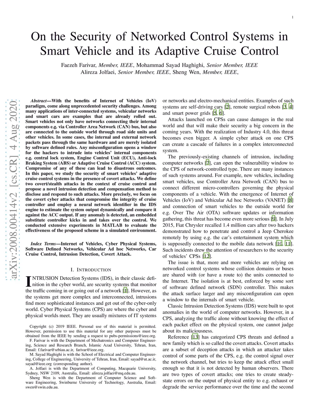 With the benefits of Internet of Vehicles (IoV) paradigm, come along unprecedented security challenges. Among many applications of inter-connected systems, vehicular networks and smart cars are examples that are already rolled out. Smart vehicles not only have networks connecting their internal components e.g. via Controller Area Network (CAN) bus, but also are connected to the outside world through road side units and other vehicles. In some cases, the internal and external network packets pass through the same hardware and are merely isolated by software defined rules. Any misconfiguration opens a window for the hackers to intrude into vehicles' internal components e.g. central lock system, Engine Control Unit (ECU), Anti-lock Braking System (ABS) or Adaptive Cruise Control (ACC) system. Compromise of any of these can lead to disastrous outcomes. In this paper, we study the security of smart vehicles' adaptive cruise control systems in the presence of covert attacks. We define two covert/stealth attacks in the context of cruise control and propose a novel intrusion detection and compensation method to disclose and respond to such attacks. More precisely, we focus on the covert cyber attacks that compromise the integrity of cruise controller and employ a neural network identifier in the IDS engine to estimate the system output dynamically and compare it against the ACC output. If any anomaly is detected, an embedded substitute controller kicks in and takes over the control. We conducted extensive experiments in MATLAB to evaluate the effectiveness of the proposed scheme in a simulated environment.
