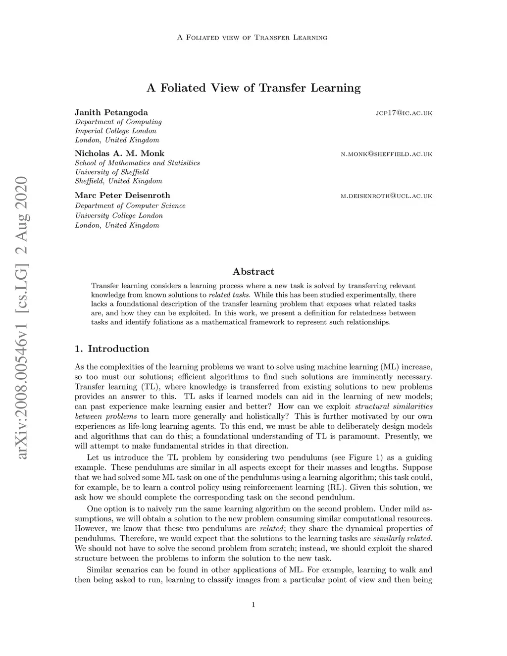 Transfer learning considers a learning process where a new task is solved by transferring relevant knowledge from known solutions to related tasks. While this has been studied experimentally, there lacks a foundational description of the transfer learning problem that exposes what related tasks are, and how they can be exploited. In this work, we present a definition for relatedness between tasks and identify foliations as a mathematical framework to represent such relationships.