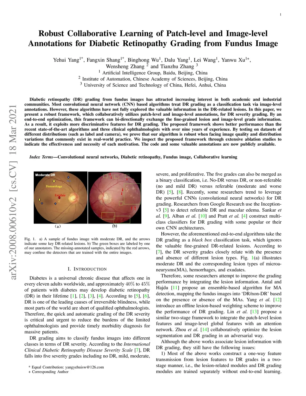 Diabetic retinopathy (DR) grading from fundus images has attracted increasing interest in both academic and industrial communities. Most convolutional neural network (CNN) based algorithms treat DR grading as a classification task via image-level annotations. However, these algorithms have not fully explored the valuable information in the DR-related lesions. In this paper, we present a robust framework, which collaboratively utilizes patch-level and image-level annotations, for DR severity grading. By an end-to-end optimization, this framework can bi-directionally exchange the fine-grained lesion and image-level grade information. As a result, it exploits more discriminative features for DR grading. The proposed framework shows better performance than the recent state-of-the-art algorithms and three clinical ophthalmologists with over nine years of experience. By testing on datasets of different distributions (such as label and camera), we prove that our algorithm is robust when facing image quality and distribution variations that commonly exist in real-world practice. We inspect the proposed framework through extensive ablation studies to indicate the effectiveness and necessity of each motivation. The code and some valuable annotations are now publicly available.