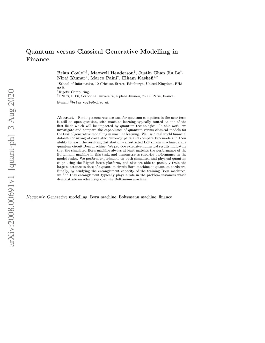Finding a concrete use case for quantum computers in the near term is still an open question, with machine learning typically touted as one of the first fields which will be impacted by quantum technologies. In this work, we investigate and compare the capabilities of quantum versus classical models for the task of generative modelling in machine learning. We use a real world financial dataset consisting of correlated currency pairs and compare two models in their ability to learn the resulting distribution - a restricted Boltzmann machine, and a quantum circuit Born machine. We provide extensive numerical results indicating that the simulated Born machine always at least matches the performance of the Boltzmann machine in this task, and demonstrates superior performance as the model scales. We perform experiments on both simulated and physical quantum chips using the Rigetti forest platform, and also are able to partially train the largest instance to date of a quantum circuit Born machine on quantum hardware. Finally, by studying the entanglement capacity of the training Born machines, we find that entanglement typically plays a role in the problem instances which demonstrate an advantage over the Boltzmann machine.