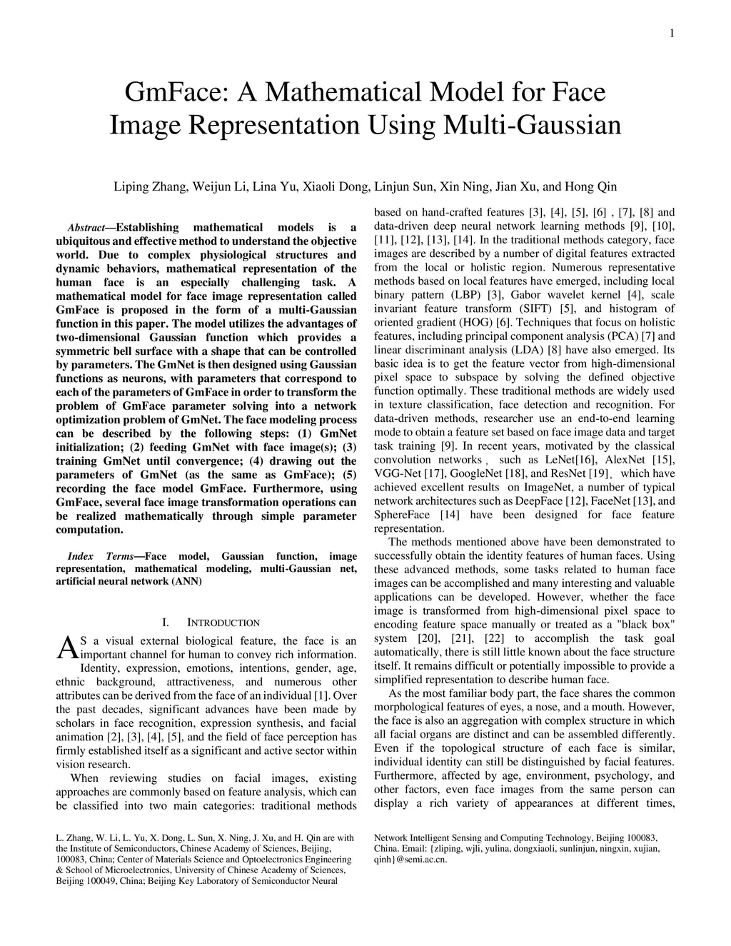 Establishing mathematical models is a ubiquitous and effective method to understand the objective world. Due to complex physiological structures and dynamic behaviors, mathematical representation of the human face is an especially challenging task. A mathematical model for face image representation called GmFace is proposed in the form of a multi-Gaussian function in this paper. The model utilizes the advantages of two-dimensional Gaussian function which provides a symmetric bell surface with a shape that can be controlled by parameters. The GmNet is then designed using Gaussian functions as neurons, with parameters that correspond to each of the parameters of GmFace in order to transform the problem of GmFace parameter solving into a network optimization problem of GmNet. The face modeling process can be described by the following steps: (1) GmNet initialization; (2) feeding GmNet with face image(s); (3) training GmNet until convergence; (4) drawing out the parameters of GmNet (as the same as GmFace); (5) recording the face model GmFace. Furthermore, using GmFace, several face image transformation operations can be realized mathematically through simple parameter computation.