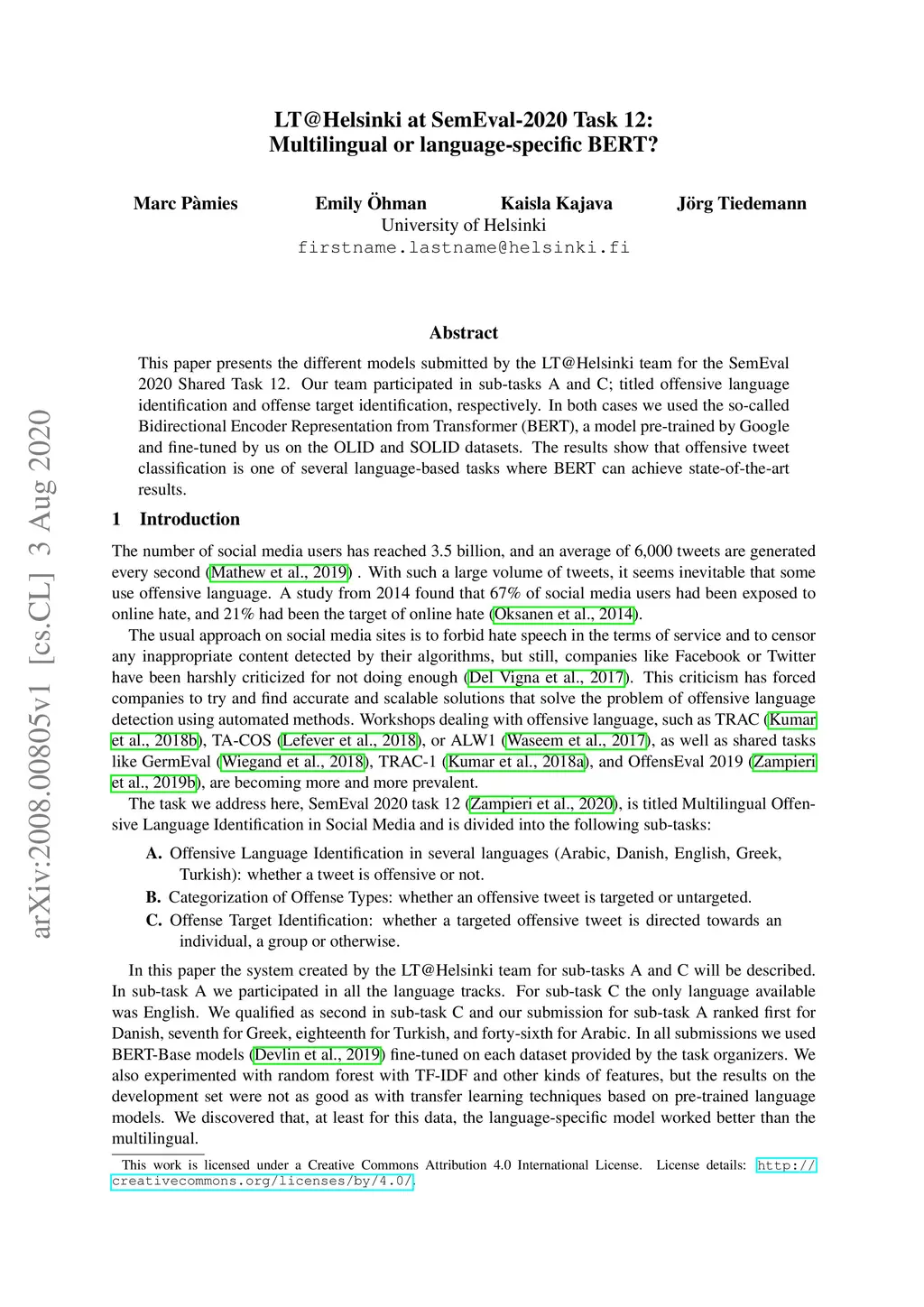 This paper presents the different models submitted by the LT@Helsinki team for the SemEval 2020 Shared Task 12. Our team participated in sub-tasks A and C; titled offensive language identification and offense target identification, respectively. In both cases we used the so-called Bidirectional Encoder Representation from Transformer (BERT), a model pre-trained by Google and fine-tuned by us on the OLID and SOLID datasets. The results show that offensive tweet classification is one of several language-based tasks where BERT can achieve state-of-the-art results.