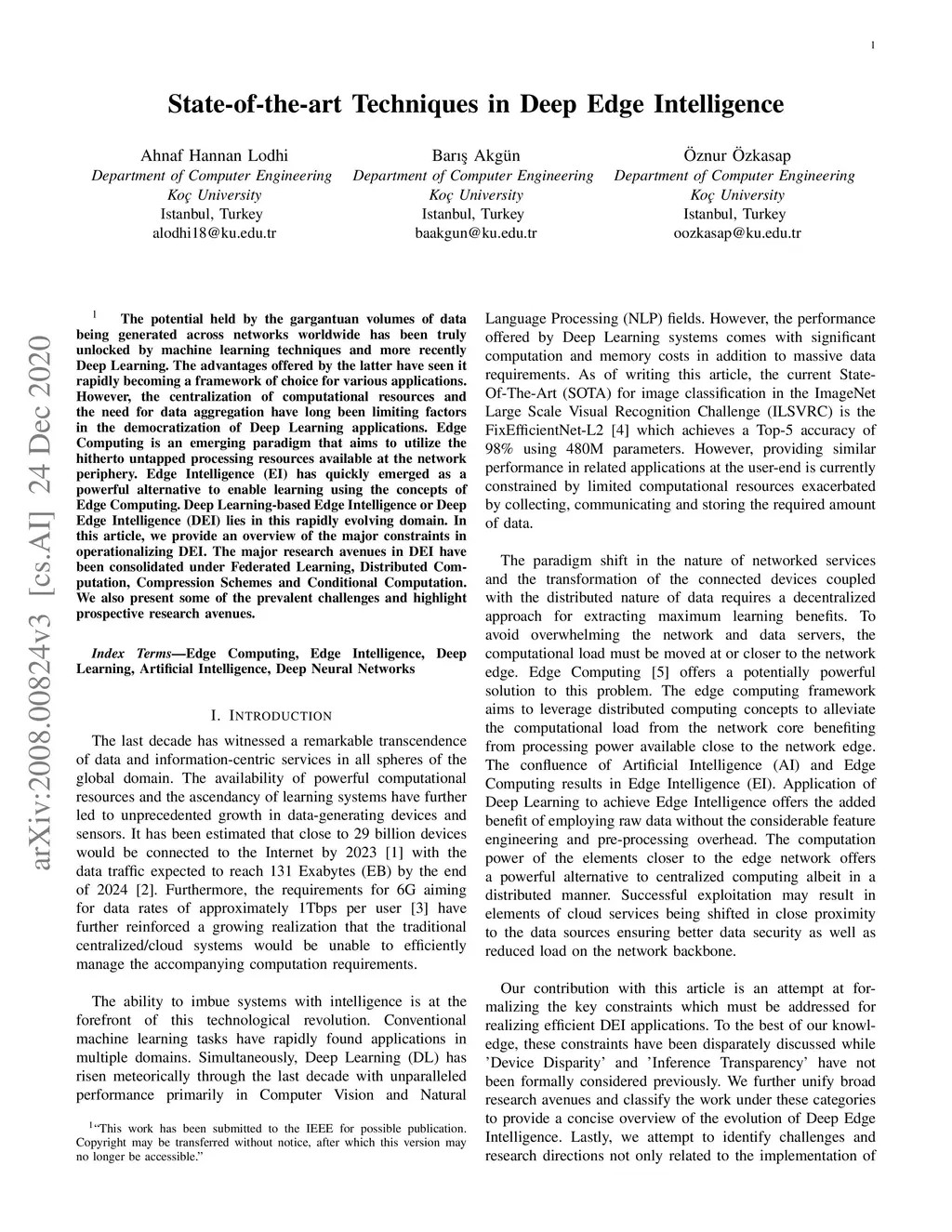 The potential held by the gargantuan volumes of data being generated across networks worldwide has been truly unlocked by machine learning techniques and more recently Deep Learning. The advantages offered by the latter have seen it rapidly becoming a framework of choice for various applications. However, the centralization of computational resources and the need for data aggregation have long been limiting factors in the democratization of Deep Learning applications. Edge Computing is an emerging paradigm that aims to utilize the hitherto untapped processing resources available at the network periphery. Edge Intelligence (EI) has quickly emerged as a powerful alternative to enable learning using the concepts of Edge Computing. Deep Learning-based Edge Intelligence or Deep Edge Intelligence (DEI) lies in this rapidly evolving domain. In this article, we provide an overview of the major constraints in operationalizing DEI. The major research avenues in DEI have been consolidated under Federated Learning, Distributed Computation, Compression Schemes and Conditional Computation. We also present some of the prevalent challenges and highlight prospective research avenues.