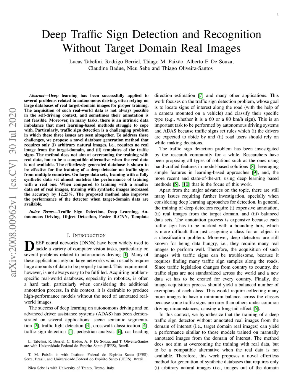 Deep learning has been successfully applied to several problems related to autonomous driving, often relying on large databases of real target-domain images for proper training. The acquisition of such real-world data is not always possible in the self-driving context, and sometimes their annotation is not feasible. Moreover, in many tasks, there is an intrinsic data imbalance that most learning-based methods struggle to cope with. Particularly, traffic sign detection is a challenging problem in which these three issues are seen altogether. To address these challenges, we propose a novel database generation method that requires only (i) arbitrary natural images, i.e., requires no real image from the target-domain, and (ii) templates of the traffic signs. The method does not aim at overcoming the training with real data, but to be a compatible alternative when the real data is not available. The effortlessly generated database is shown to be effective for the training of a deep detector on traffic signs from multiple countries. On large data sets, training with a fully synthetic data set almost matches the performance of training with a real one. When compared to training with a smaller data set of real images, training with synthetic images increased the accuracy by 12.25%. The proposed method also improves the performance of the detector when target-domain data are available.