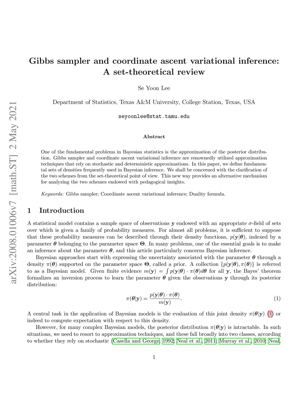 One of the fundamental problems in Bayesian statistics is the approximation of the posterior distribution. Gibbs sampler and coordinate ascent variational inference are renownedly utilized approximation techniques that rely on stochastic and deterministic approximations. In this paper, we define fundamental sets of densities frequently used in Bayesian inference. We shall be concerned with the clarification of the two schemes from the set-theoretical point of view. This new way provides an alternative mechanism for analyzing the two schemes endowed with pedagogical insights.