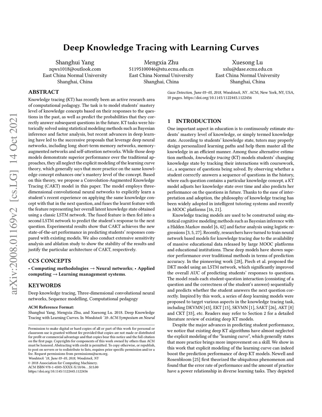 Knowledge tracing (KT) has recently been an active research area of computational pedagogy. The task is to model students' mastery level of knowledge concepts based on their responses to the questions in the past, as well as predict the probabilities that they correctly answer subsequent questions in the future. KT tasks were historically solved using statistical modeling methods such as Bayesian inference and factor analysis, but recent advances in deep learning have led to the successive proposals that leverage deep neural networks, including long short-term memory networks, memory-augmented networks and self-attention networks. While those deep models demonstrate superior performance over the traditional approaches, they all neglect the explicit modeling of the learning curve theory, which generally says that more practice on the same knowledge concept enhances one's mastery level of the concept. Based on this theory, we propose a Convolution-Augmented Knowledge Tracing (CAKT) model in this paper. The model employs three-dimensional convolutional neural networks to explicitly learn a student's recent experience on applying the same knowledge concept with that in the next question, and fuses the learnt feature with the feature representing her overall latent knowledge state obtained using a classic LSTM network. The fused feature is then fed into a second LSTM network to predict the student's response to the next question. Experimental results show that CAKT achieves the new state-of-the-art performance in predicting students' responses compared with existing models. We also conduct extensive sensitivity analysis and ablation study to show the stability of the results and justify the particular architecture of CAKT, respectively.
