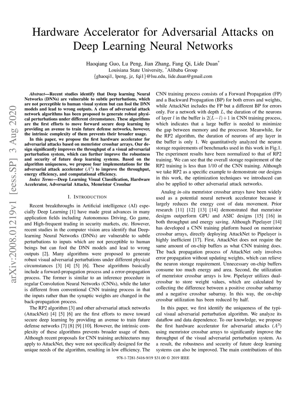 Recent studies identify that Deep learning Neural Networks (DNNs) are vulnerable to subtle perturbations, which are not perceptible to human visual system but can fool the DNN models and lead to wrong outputs. A class of adversarial attack network algorithms has been proposed to generate robust physical perturbations under different circumstances. These algorithms are the first efforts to move forward secure deep learning by providing an avenue to train future defense networks, however, the intrinsic complexity of them prevents their broader usage. In this paper, we propose the first hardware accelerator for adversarial attacks based on memristor crossbar arrays. Our design significantly improves the throughput of a visual adversarial perturbation system, which can further improve the robustness and security of future deep learning systems. Based on the algorithm uniqueness, we propose four implementations for the adversarial attack accelerator () to improve the throughput, energy efficiency, and computational efficiency.