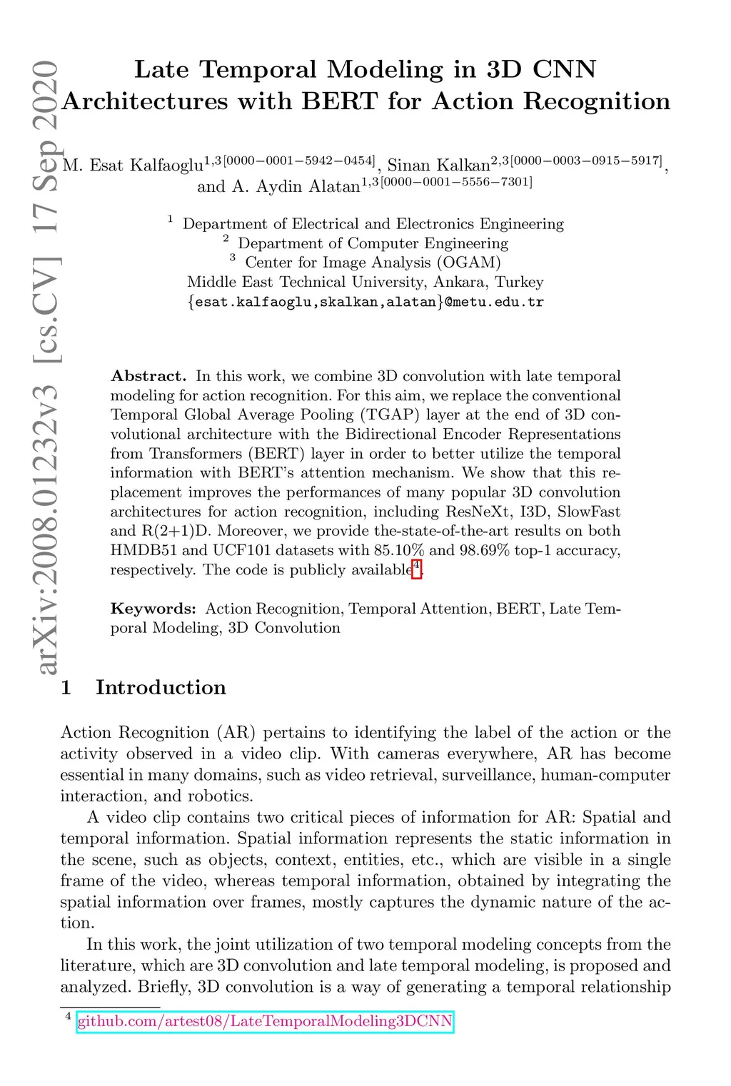 In this work, we combine 3D convolution with late temporal modeling for action recognition. For this aim, we replace the conventional Temporal Global Average Pooling (TGAP) layer at the end of 3D convolutional architecture with the Bidirectional Encoder Representations from Transformers (BERT) layer in order to better utilize the temporal information with BERT's attention mechanism. We show that this replacement improves the performances of many popular 3D convolution architectures for action recognition, including ResNeXt, I3D, SlowFast and R(2+1)D. Moreover, we provide the-state-of-the-art results on both HMDB51 and UCF101 datasets with 85.10% and 98.69% top-1 accuracy, respectively. The code is publicly available.
