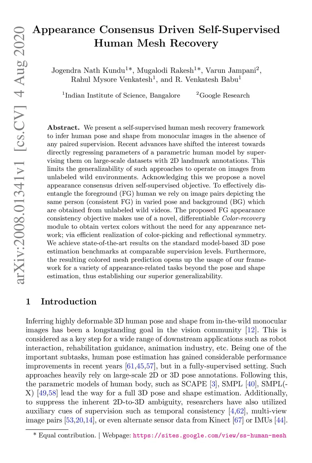 Appearance Consensus Driven Self-Supervised Human Mesh Recovery