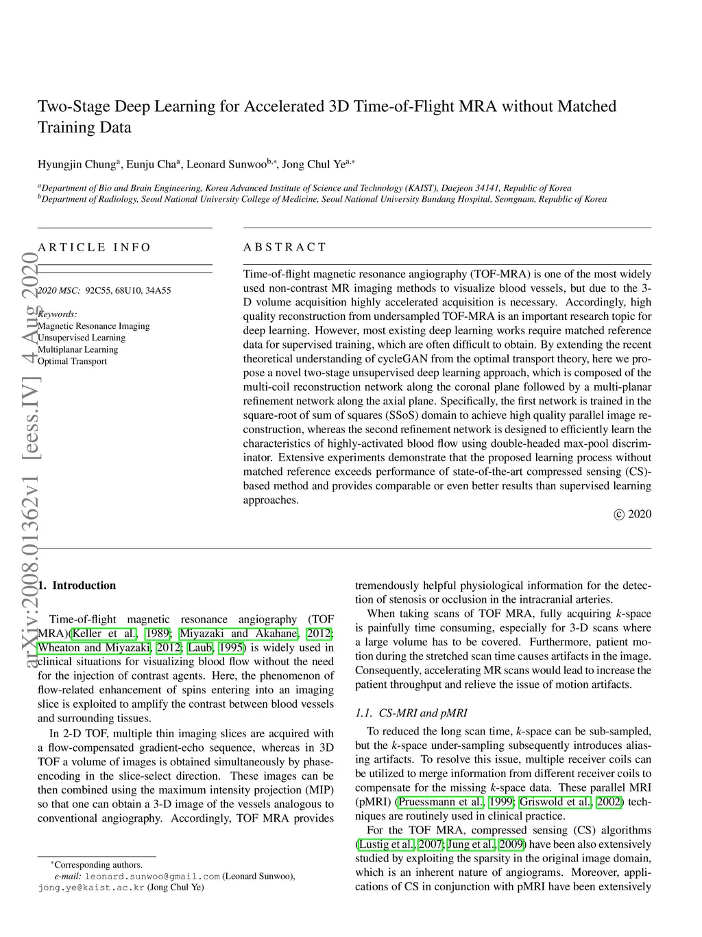 Two-Stage Deep Learning for Accelerated 3D Time-of-Flight MRA without