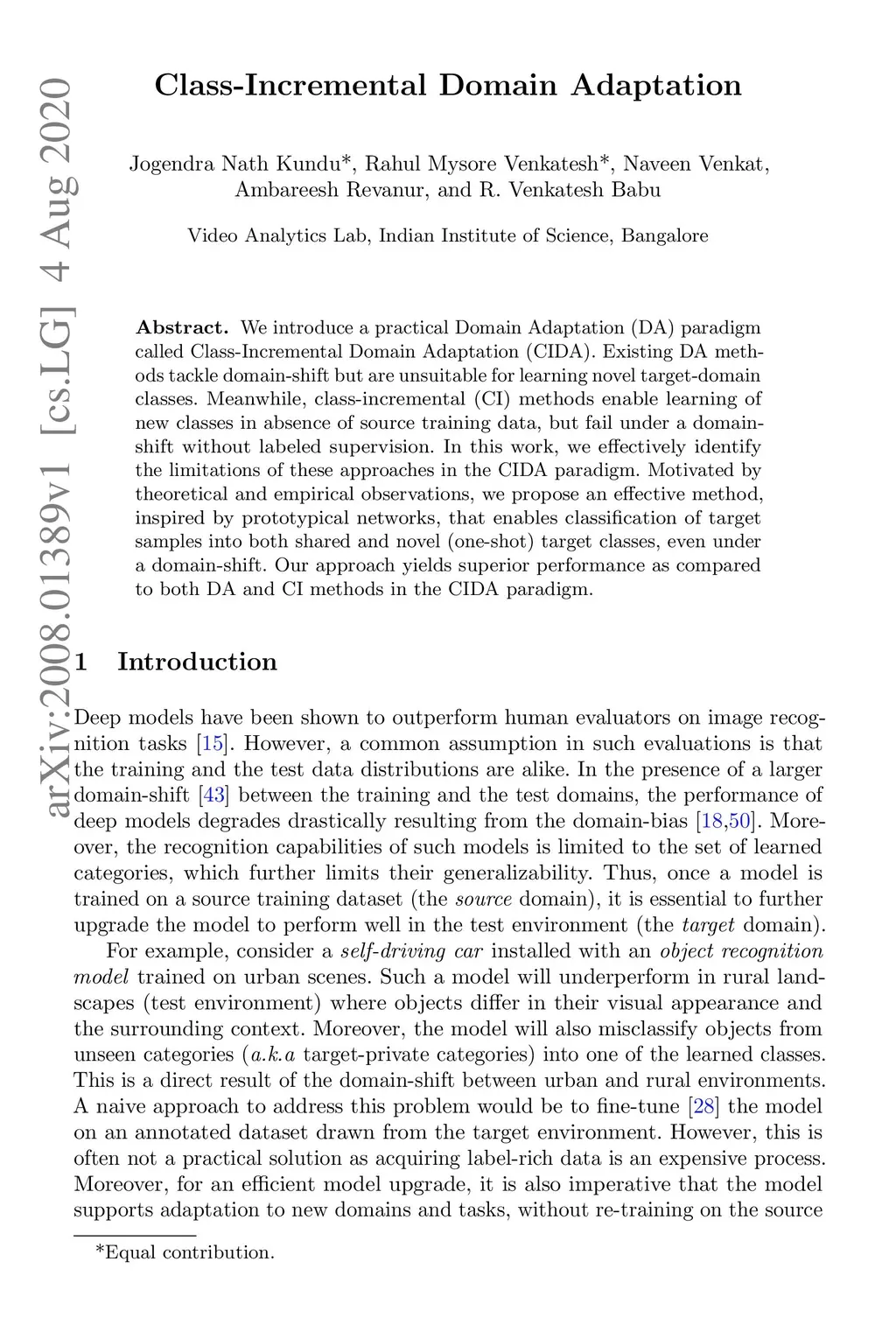 We introduce a practical Domain Adaptation (DA) paradigm called Class-Incremental Domain Adaptation (CIDA). Existing DA methods tackle domain-shift but are unsuitable for learning novel target-domain classes. Meanwhile, class-incremental (CI) methods enable learning of new classes in absence of source training data but fail under a domain-shift without labeled supervision. In this work, we effectively identify the limitations of these approaches in the CIDA paradigm. Motivated by theoretical and empirical observations, we propose an effective method, inspired by prototypical networks, that enables classification of target samples into both shared and novel (one-shot) target classes, even under a domain-shift. Our approach yields superior performance as compared to both DA and CI methods in the CIDA paradigm.