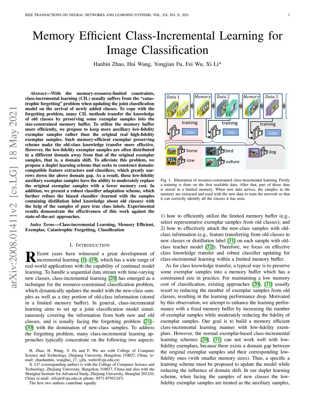 With the memory-resource-limited constraints, class-incremental learning (CIL) usually suffers from the "catastrophic forgetting" problem when updating the joint classification model on the arrival of newly added classes. To cope with the forgetting problem, many CIL methods transfer the knowledge of old classes by preserving some exemplar samples into the size-constrained memory buffer. To utilize the memory buffer more efficiently, we propose to keep more auxiliary low-fidelity exemplar samples rather than the original real high-fidelity exemplar samples. Such a memory-efficient exemplar preserving scheme makes the old-class knowledge transfer more effective. However, the low-fidelity exemplar samples are often distributed in a different domain away from that of the original exemplar samples, that is, a domain shift. To alleviate this problem, we propose a duplet learning scheme that seeks to construct domain-compatible feature extractors and classifiers, which greatly narrows down the above domain gap. As a result, these low-fidelity auxiliary exemplar samples have the ability to moderately replace the original exemplar samples with a lower memory cost. In addition, we present a robust classifier adaptation scheme, which further refines the biased classifier (learned with the samples containing distillation label knowledge about old classes) with the help of the samples of pure true class labels. Experimental results demonstrate the effectiveness of this work against the state-of-the-art approaches.