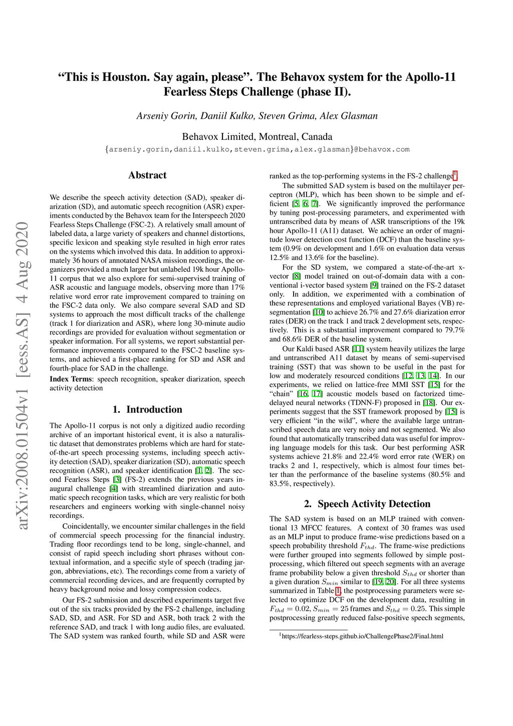 We describe the speech activity detection (SAD), speaker diarization (SD), and automatic speech recognition (ASR) experiments conducted by the Behavox team for the Interspeech 2020 Fearless Steps Challenge (FSC-2). A relatively small amount of labeled data, a large variety of speakers and channel distortions, specific lexicon and speaking style resulted in high error rates on the systems which involved this data. In addition to approximately 36 hours of annotated NASA mission recordings, the organizers provided a much larger but unlabeled 19k hour Apollo-11 corpus that we also explore for semi-supervised training of ASR acoustic and language models, observing more than 17% relative word error rate improvement compared to training on the FSC-2 data only. We also compare several SAD and SD systems to approach the most difficult tracks of the challenge (track 1 for diarization and ASR), where long 30-minute audio recordings are provided for evaluation without segmentation or speaker information. For all systems, we report substantial performance improvements compared to the FSC-2 baseline systems, and achieved a first-place ranking for SD and ASR and fourth-place for SAD in the challenge.