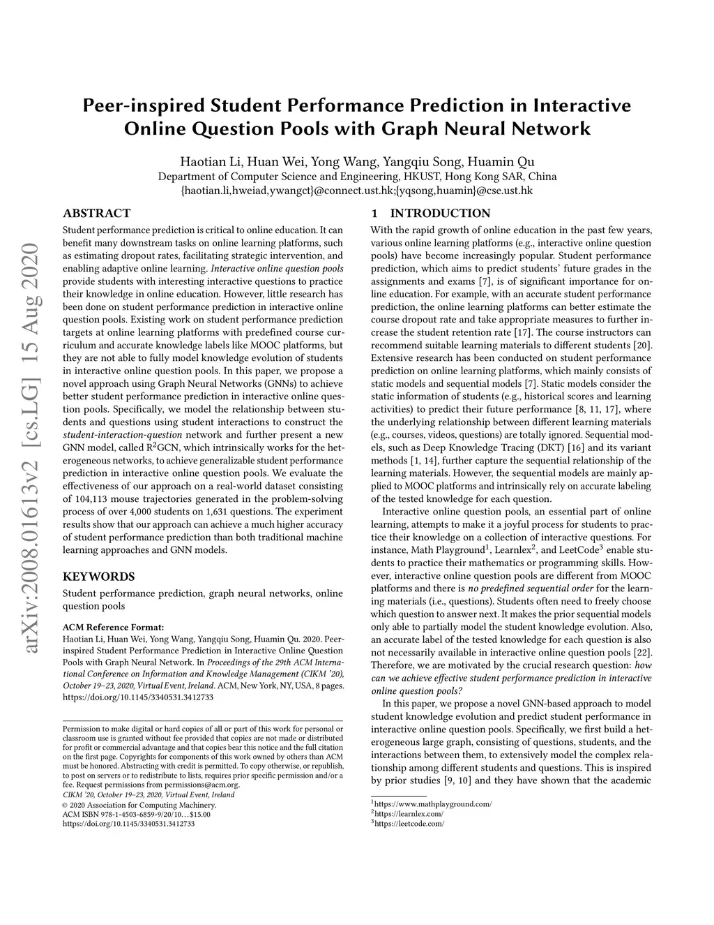 Student performance prediction is critical to online education. It can benefit many downstream tasks on online learning platforms, such as estimating dropout rates, facilitating strategic intervention, and enabling adaptive online learning. Interactive online question pools provide students with interesting interactive questions to practice their knowledge in online education. However, little research has been done on student performance prediction in interactive online question pools. Existing work on student performance prediction targets at online learning platforms with predefined course curriculum and accurate knowledge labels like MOOC platforms, but they are not able to fully model knowledge evolution of students in interactive online question pools. In this paper, we propose a novel approach using Graph Neural Networks (GNNs) to achieve better student performance prediction in interactive online question pools. Specifically, we model the relationship between students and questions using student interactions to construct the student-interaction-question network and further present a new GNN model, called R^2GCN, which intrinsically works for the heterogeneous networks, to achieve generalizable student performance prediction in interactive online question pools. We evaluate the effectiveness of our approach on a real-world dataset consisting of 104,113 mouse trajectories generated in the problem-solving process of over 4000 students on 1631 questions. The experiment results show that our approach can achieve a much higher accuracy of student performance prediction than both traditional machine learning approaches and GNN models.