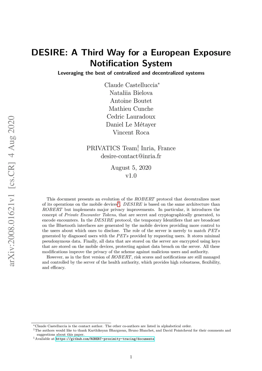 This document presents an evolution of the ROBERT protocol that decentralizes most of its operations on the mobile devices. DESIRE is based on the same architecture than ROBERT but implements major privacy improvements. In particular, it introduces the concept of Private Encounter Tokens, that are secret and cryptographically generated, to encode encounters. In the DESIRE protocol, the temporary Identifiers that are broadcast on the Bluetooth interfaces are generated by the mobile devices providing more control to the users about which ones to disclose. The role of the server is merely to match PETs generated by diagnosed users with the PETs provided by requesting users. It stores minimal pseudonymous data. Finally, all data that are stored on the server are encrypted using keys that are stored on the mobile devices, protecting against data breach on the server. All these modifications improve the privacy of the scheme against malicious users and authority. However, as in the first version of ROBERT, risk scores and notifications are still managed and controlled by the server of the health authority, which provides high robustness, flexibility, and efficacy.