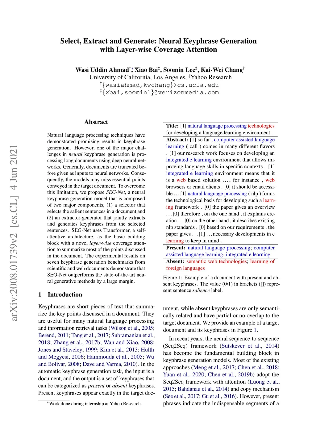 In recent years, deep neural sequence-to-sequence framework has demonstrated promising results in keyphrase generation. However, processing long documents using such deep neural networks requires high computational resources. To reduce the computational cost, the documents are typically truncated before given as inputs. As a result, the models may miss essential points conveyed in a document. Moreover, most of the existing methods are either extractive (identify important phrases from the document) or generative (generate phrases word by word), and hence they do not benefit from the advantages of both modeling techniques. To address these challenges, we propose \emph{SEG-Net}, a neural keyphrase generation model that is composed of two major components, (1) a selector that selects the salient sentences in a document, and (2) an extractor-generator that jointly extracts and generates keyphrases from the selected sentences. SEG-Net uses a self-attentive architecture, known as, \emph{Transformer} as the building block with a couple of uniqueness. First, SEG-Net incorporates a novel \emph{layer-wise} coverage attention to summarize most of the points discussed in the target document. Second, it uses an \emph{informed} copy attention mechanism to encourage focusing on different segments of the document during keyphrase extraction and generation. Besides, SEG-Net jointly learns keyphrase generation and their part-of-speech tag prediction, where the later provides syntactic supervision to the former. The experimental results on seven keyphrase generation benchmarks from scientific and web documents demonstrate that SEG-Net outperforms the state-of-the-art neural generative methods by a large margin in both domains.