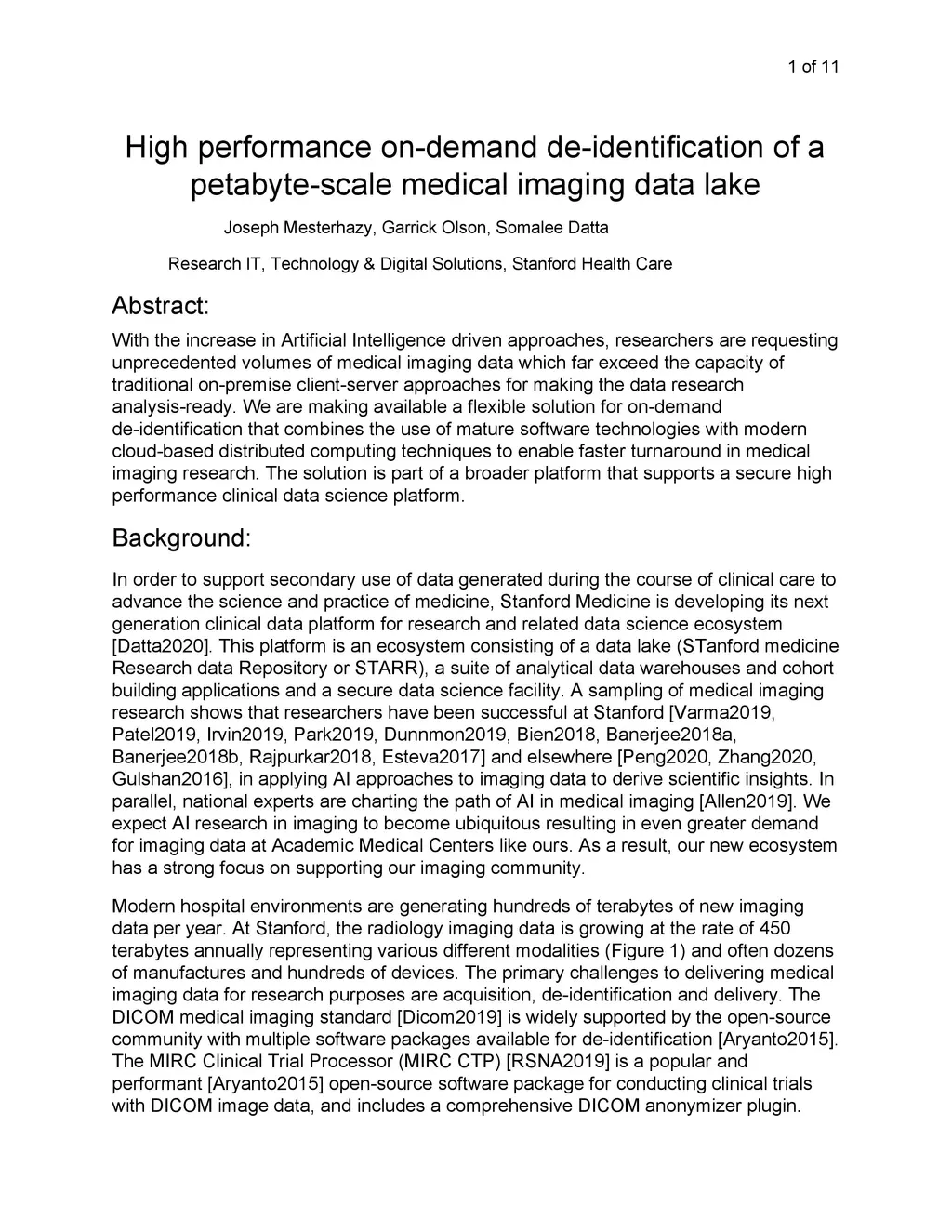 With the increase in Artificial Intelligence driven approaches, researchers are requesting unprecedented volumes of medical imaging data which far exceed the capacity of traditional on-premise client-server approaches for making the data research analysis-ready. We are making available a flexible solution for on-demand de-identification that combines the use of mature software technologies with modern cloud-based distributed computing techniques to enable faster turnaround in medical imaging research. The solution is part of a broader platform that supports a secure high performance clinical data science platform.