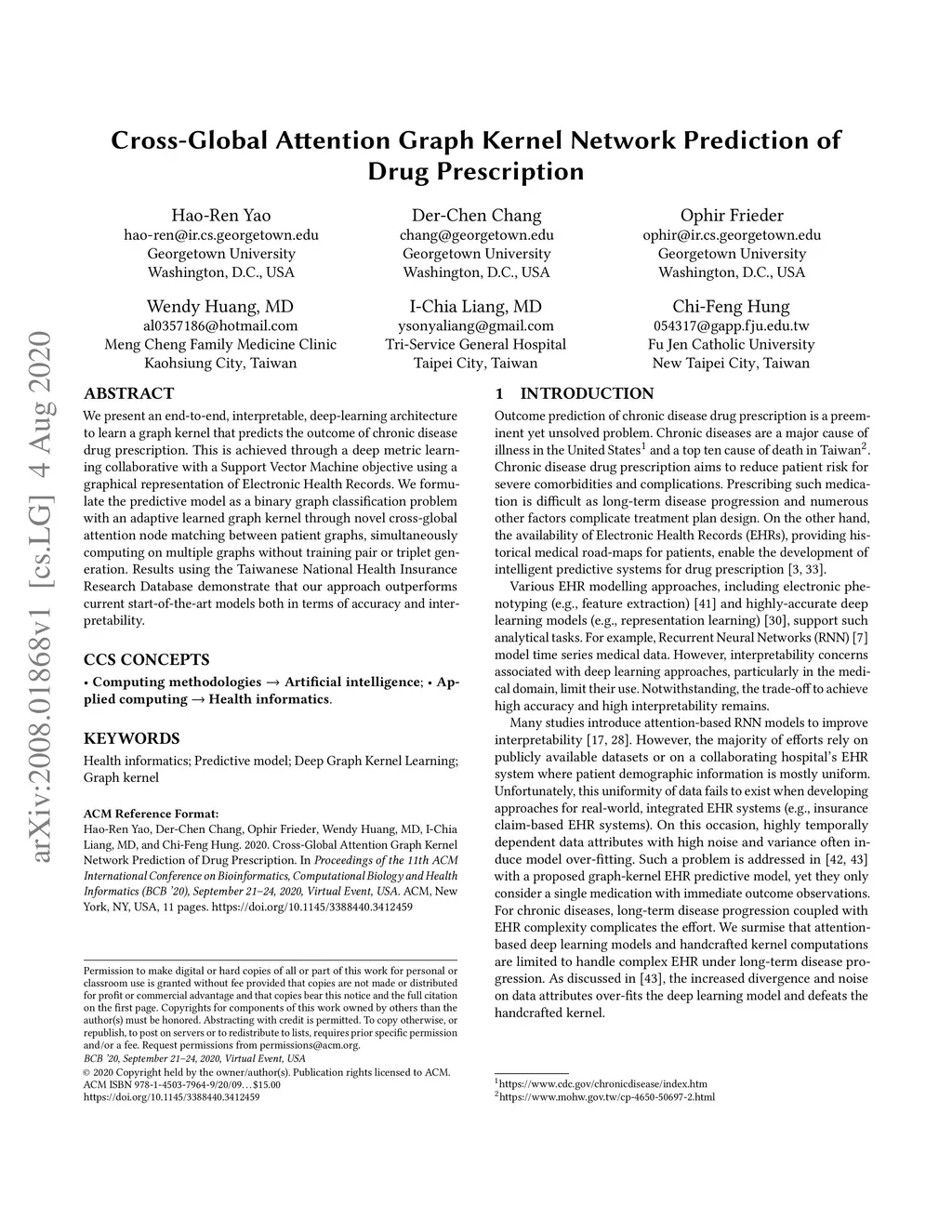 We present an end-to-end, interpretable, deep-learning architecture to learn a graph kernel that predicts the outcome of chronic disease drug prescription. This is achieved through a deep metric learning collaborative with a Support Vector Machine objective using a graphical representation of Electronic Health Records. We formulate the predictive model as a binary graph classification problem with an adaptive learned graph kernel through novel cross-global attention node matching between patient graphs, simultaneously computing on multiple graphs without training pair or triplet generation. Results using the Taiwanese National Health Insurance Research Database demonstrate that our approach outperforms current start-of-the-art models both in terms of accuracy and interpretability.