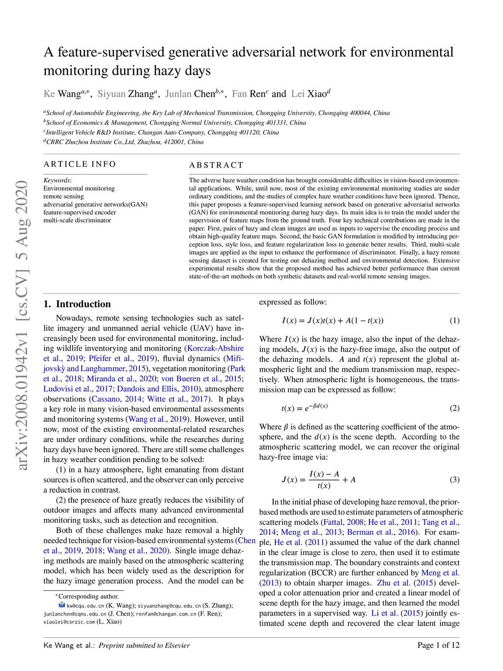 The adverse haze weather condition has brought considerable difficulties in vision-based environmental applications. While, until now, most of the existing environmental monitoring studies are under ordinary conditions, and the studies of complex haze weather conditions have been ignored. Thence, this paper proposes a feature-supervised learning network based on generative adversarial networks (GAN) for environmental monitoring during hazy days. Its main idea is to train the model under the supervision of feature maps from the ground truth. Four key technical contributions are made in the paper. First, pairs of hazy and clean images are used as inputs to supervise the encoding process and obtain high-quality feature maps. Second, the basic GAN formulation is modified by introducing perception loss, style loss, and feature regularization loss to generate better results. Third, multi-scale images are applied as the input to enhance the performance of discriminator. Finally, a hazy remote sensing dataset is created for testing our dehazing method and environmental detection. Extensive experimental results show that the proposed method has achieved better performance than current state-of-the-art methods on both synthetic datasets and real-world remote sensing images.