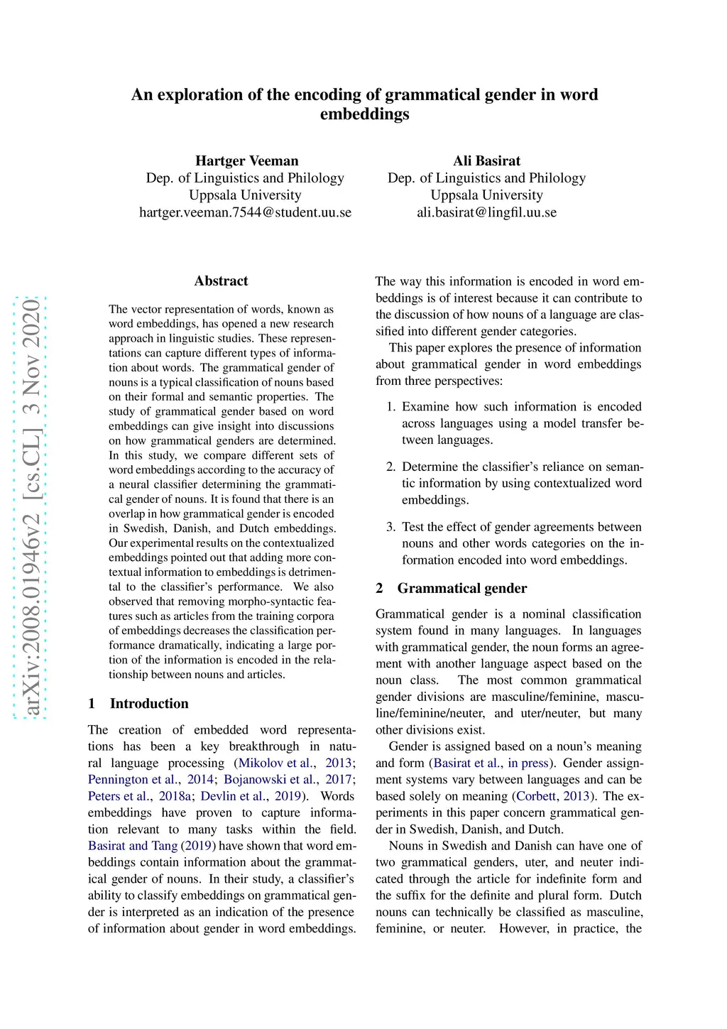 The vector representation of words, known as word embeddings, has opened a new research approach in linguistic studies. These representations can capture different types of information about words. The grammatical gender of nouns is a typical classification of nouns based on their formal and semantic properties. The study of grammatical gender based on word embeddings can give insight into discussions on how grammatical genders are determined. In this study, we compare different sets of word embeddings according to the accuracy of a neural classifier determining the grammatical gender of nouns. It is found that there is an overlap in how grammatical gender is encoded in Swedish, Danish, and Dutch embeddings. Our experimental results on the contextualized embeddings pointed out that adding more contextual information to embeddings is detrimental to the classifier's performance. We also observed that removing morpho-syntactic features such as articles from the training corpora of embeddings decreases the classification performance dramatically, indicating a large portion of the information is encoded in the relationship between nouns and articles.
