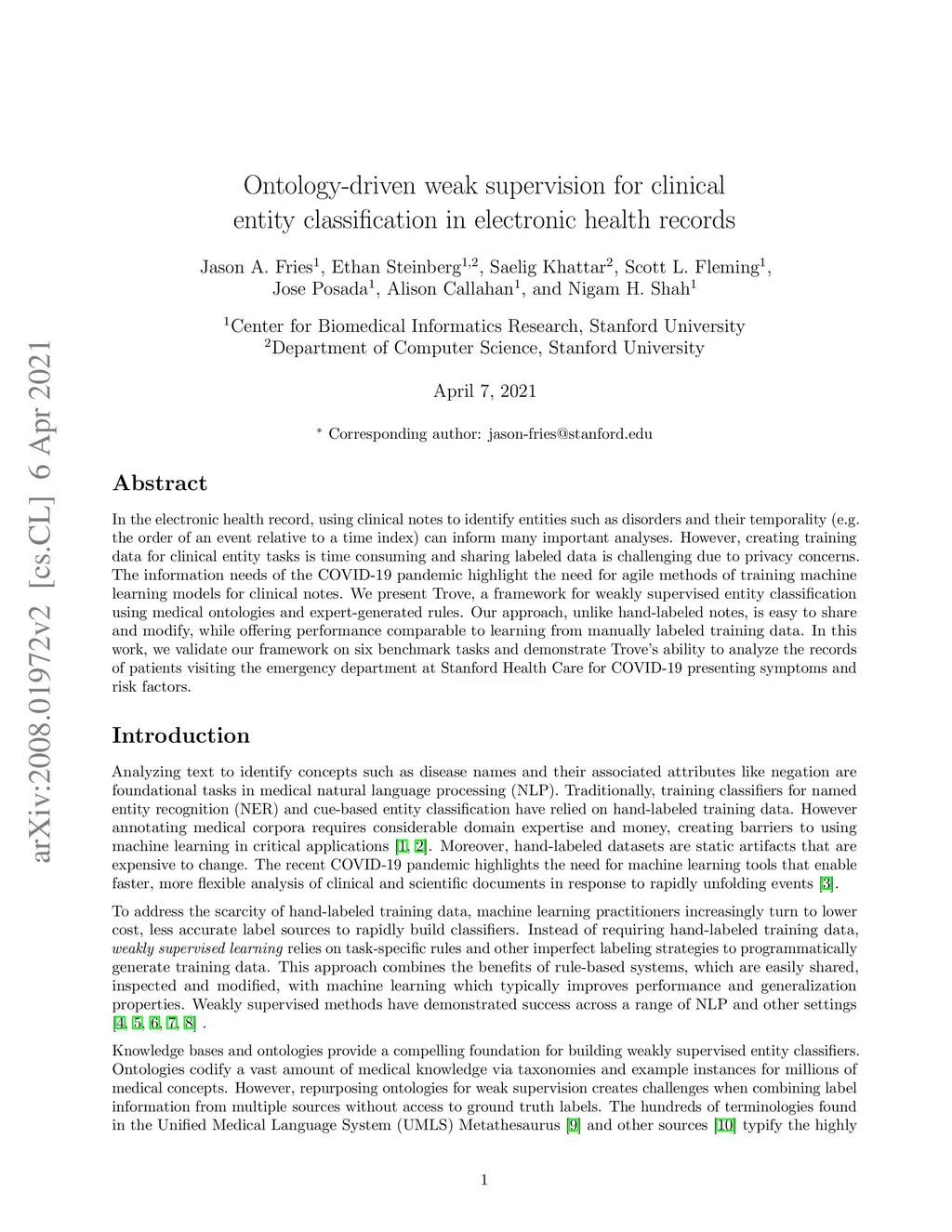 In the electronic health record, using clinical notes to identify entities such as disorders and their temporality (e.g. the order of an event relative to a time index) can inform many important analyses. However, creating training data for clinical entity tasks is time consuming and sharing labeled data is challenging due to privacy concerns. The information needs of the COVID-19 pandemic highlight the need for agile methods of training machine learning models for clinical notes. We present Trove, a framework for weakly supervised entity classification using medical ontologies and expert-generated rules. Our approach, unlike hand-labeled notes, is easy to share and modify, while offering performance comparable to learning from manually labeled training data. In this work, we validate our framework on six benchmark tasks and demonstrate Trove's ability to analyze the records of patients visiting the emergency department at Stanford Health Care for COVID-19 presenting symptoms and risk factors.