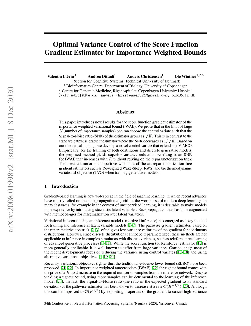 This paper introduces novel results for the score function gradient estimator of the importance weighted variational bound (IWAE). We prove that in the limit of large (number of importance samples) one can choose the control variate such that the Signal-to-Noise ratio (SNR) of the estimator grows as . This is in contrast to the standard pathwise gradient estimator where the SNR decreases as . Based on our theoretical findings we develop a novel control variate that extends on VIMCO. Empirically, for the training of both continuous and discrete generative models, the proposed method yields superior variance reduction, resulting in an SNR for IWAE that increases with without relying on the reparameterization trick. The novel estimator is competitive with state-of-the-art reparameterization-free gradient estimators such as Reweighted Wake-Sleep (RWS) and the thermodynamic variational objective (TVO) when training generative models.