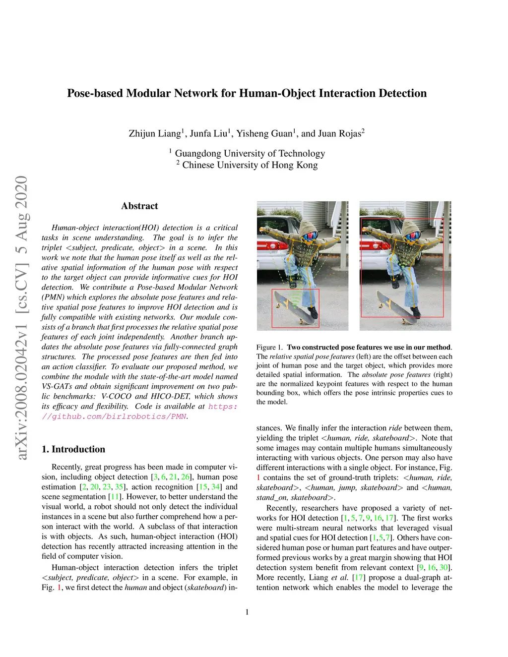 Human-object interaction(HOI) detection is a critical task in scene understanding. The goal is to infer the triplet <subject, predicate, object> in a scene. In this work, we note that the human pose itself as well as the relative spatial information of the human pose with respect to the target object can provide informative cues for HOI detection. We contribute a Pose-based Modular Network (PMN) which explores the absolute pose features and relative spatial pose features to improve HOI detection and is fully compatible with existing networks. Our module consists of a branch that first processes the relative spatial pose features of each joint independently. Another branch updates the absolute pose features via fully connected graph structures. The processed pose features are then fed into an action classifier. To evaluate our proposed method, we combine the module with the state-of-the-art model named VS-GATs and obtain significant improvement on two public benchmarks: V-COCO and HICO-DET, which shows its efficacy and flexibility. Code is available at \url{https://github.com/birlrobotics/PMN}.