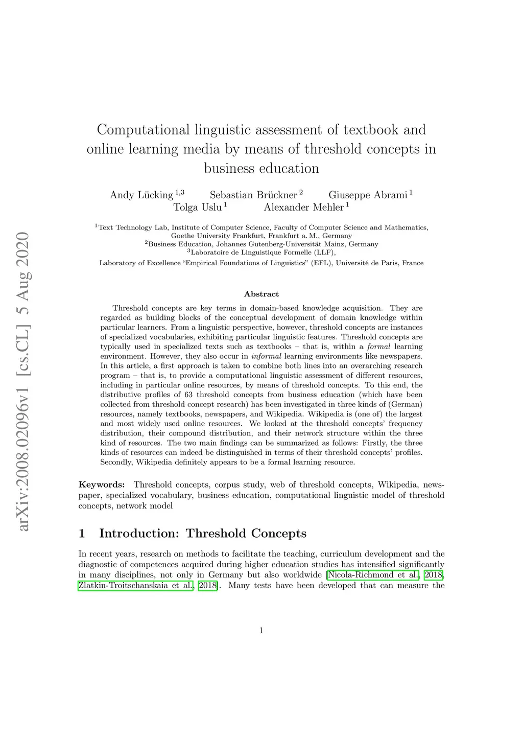 Threshold concepts are key terms in domain-based knowledge acquisition. They are regarded as building blocks of the conceptual development of domain knowledge within particular learners. From a linguistic perspective, however, threshold concepts are instances of specialized vocabularies, exhibiting particular linguistic features. Threshold concepts are typically used in specialized texts such as textbooks -- that is, within a formal learning environment. However, they also occur in informal learning environments like newspapers. In this article, a first approach is taken to combine both lines into an overarching research program - that is, to provide a computational linguistic assessment of different resources, including in particular online resources, by means of threshold concepts. To this end, the distributive profiles of 63 threshold concepts from business education (which have been collected from threshold concept research) has been investigated in three kinds of (German) resources, namely textbooks, newspapers, and Wikipedia. Wikipedia is (one of) the largest and most widely used online resources. We looked at the threshold concepts' frequency distribution, their compound distribution, and their network structure within the three kind of resources. The two main findings can be summarized as follows: Firstly, the three kinds of resources can indeed be distinguished in terms of their threshold concepts' profiles. Secondly, Wikipedia definitely appears to be a formal learning resource.