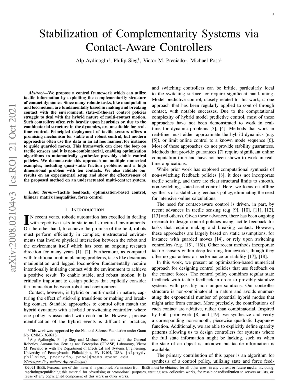 We propose a control framework which can utilize tactile information by exploiting the complementarity structure of contact dynamics. Since many robotic tasks, like manipulation and locomotion, are fundamentally based in making and breaking contact with the environment, state-of-the-art control policies struggle to deal with the hybrid nature of multi-contact motion. Such controllers often rely heavily upon heuristics or, due to the combinatorial structure in the dynamics, are unsuitable for real-time control. Principled deployment of tactile sensors offers a promising mechanism for stable and robust control, but modern approaches often use this data in an ad hoc manner, for instance to guide guarded moves. This framework can close the loop on tactile sensors and it is non-combinatorial, enabling optimization algorithms to automatically synthesize provably stable control policies. We demonstrate this approach on multiple numerical examples, including quasi-static friction problems and a high dimensional problem with ten contacts. We also validate our results on an experimental setup and show the effectiveness of the proposed method on an underactuated multi-contact system.