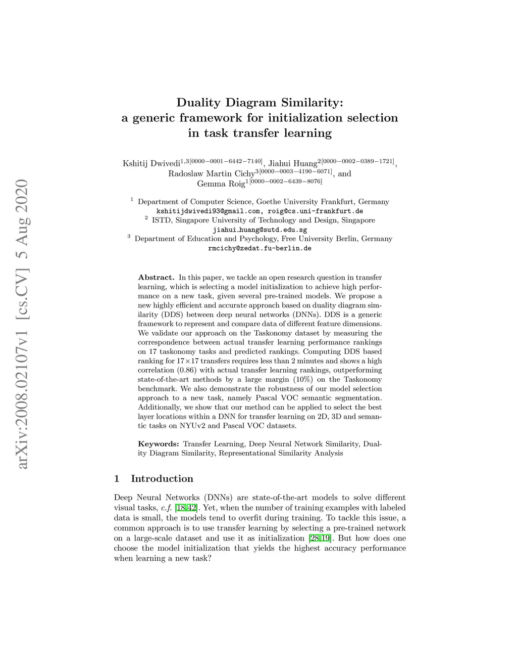 In this paper, we tackle an open research question in transfer learning, which is selecting a model initialization to achieve high performance on a new task, given several pre-trained models. We propose a new highly efficient and accurate approach based on duality diagram similarity (DDS) between deep neural networks (DNNs). DDS is a generic framework to represent and compare data of different feature dimensions. We validate our approach on the Taskonomy dataset by measuring the correspondence between actual transfer learning performance rankings on 17 taskonomy tasks and predicted rankings. Computing DDS based ranking for transfers requires less than 2 minutes and shows a high correlation () with actual transfer learning rankings, outperforming state-of-the-art methods by a large margin () on the Taskonomy benchmark. We also demonstrate the robustness of our model selection approach to a new task, namely Pascal VOC semantic segmentation. Additionally, we show that our method can be applied to select the best layer locations within a DNN for transfer learning on 2D, 3D and semantic tasks on NYUv2 and Pascal VOC datasets.
