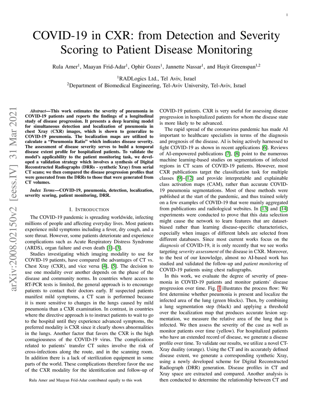 In this work, we estimate the severity of pneumonia in COVID-19 patients and conduct a longitudinal study of disease progression. To achieve this goal, we developed a deep learning model for simultaneous detection and segmentation of pneumonia in chest Xray (CXR) images and generalized to COVID-19 pneumonia. The segmentations were utilized to calculate a "Pneumonia Ratio" which indicates the disease severity. The measurement of disease severity enables to build a disease extent profile over time for hospitalized patients. To validate the model relevance to the patient monitoring task, we developed a validation strategy which involves a synthesis of Digital Reconstructed Radiographs (DRRs - synthetic Xray) from serial CT scans; we then compared the disease progression profiles that were generated from the DRRs to those that were generated from CT volumes.
