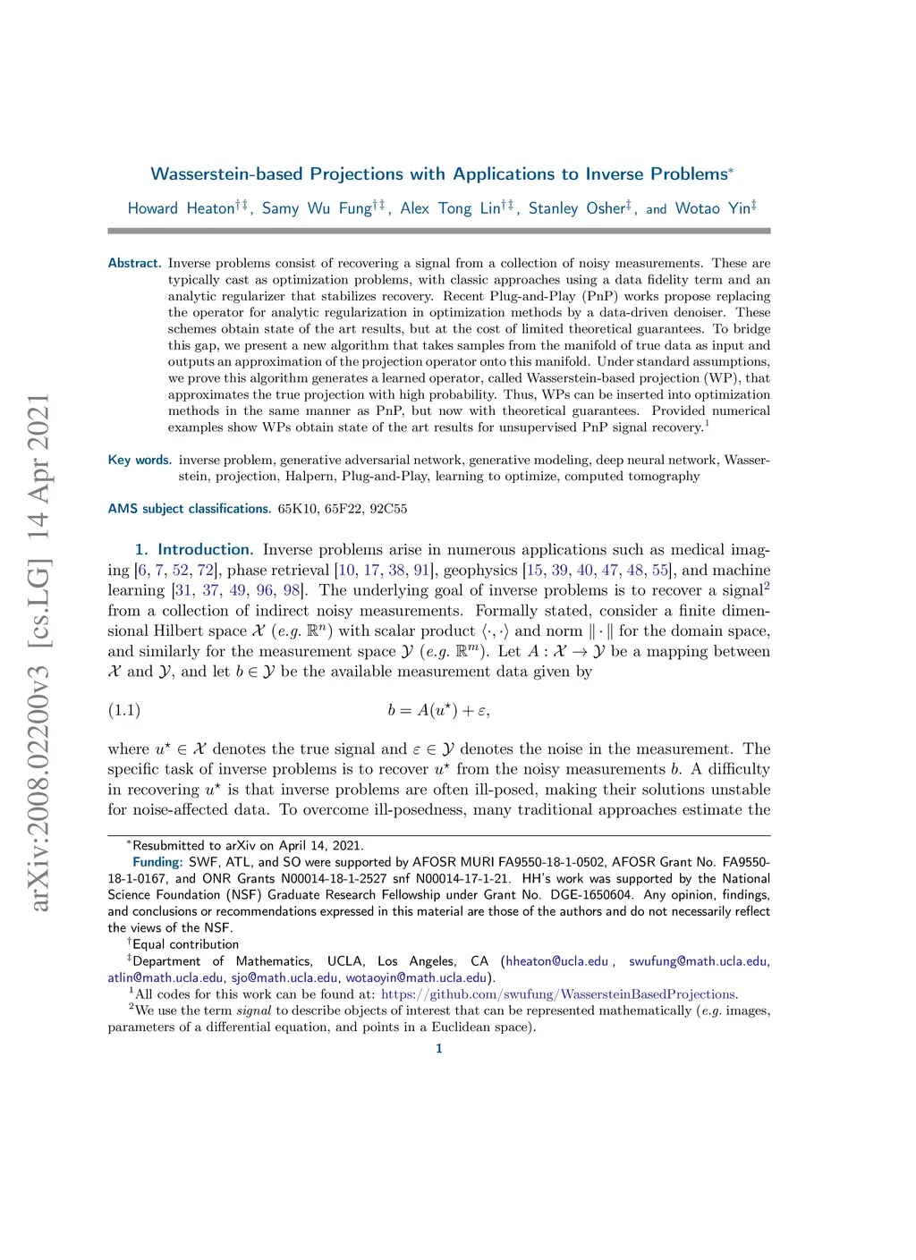 Inverse problems consist of recovering a signal from a collection of noisy measurements. These are typically cast as optimization problems, with classic approaches using a data fidelity term and an analytic regularizer that stabilizes recovery. Recent Plug-and-Play (PnP) works propose replacing the operator for analytic regularization in optimization methods by a data-driven denoiser. These schemes obtain state of the art results, but at the cost of limited theoretical guarantees. To bridge this gap, we present a new algorithm that takes samples from the manifold of true data as input and outputs an approximation of the projection operator onto this manifold. Under standard assumptions, we prove this algorithm generates a learned operator, called Wasserstein-based projection (WP), that approximates the true projection with high probability. Thus, WPs can be inserted into optimization methods in the same manner as PnP, but now with theoretical guarantees. Provided numerical examples show WPs obtain state of the art results for unsupervised PnP signal recovery.