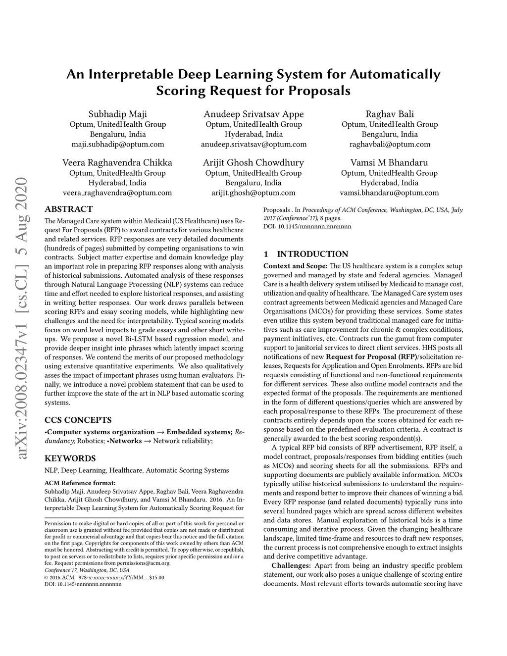 The Managed Care system within Medicaid (US Healthcare) uses Request For Proposals (RFP) to award contracts for various healthcare and related services. RFP responses are very detailed documents (hundreds of pages) submitted by competing organisations to win contracts. Subject matter expertise and domain knowledge play an important role in preparing RFP responses along with analysis of historical submissions. Automated analysis of these responses through Natural Language Processing (NLP) systems can reduce time and effort needed to explore historical responses, and assisting in writing better responses. Our work draws parallels between scoring RFPs and essay scoring models, while highlighting new challenges and the need for interpretability. Typical scoring models focus on word level impacts to grade essays and other short write-ups. We propose a novel Bi-LSTM based regression model, and provide deeper insight into phrases which latently impact scoring of responses. We contend the merits of our proposed methodology using extensive quantitative experiments. We also qualitatively asses the impact of important phrases using human evaluators. Finally, we introduce a novel problem statement that can be used to further improve the state of the art in NLP based automatic scoring systems.