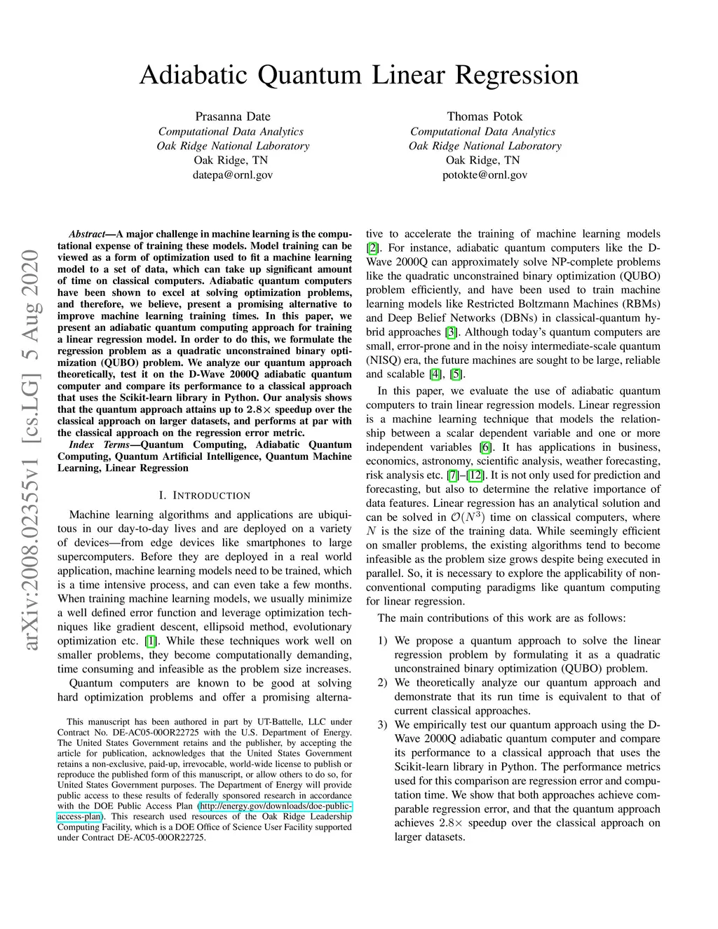 Adiabatic Quantum Linear Regression