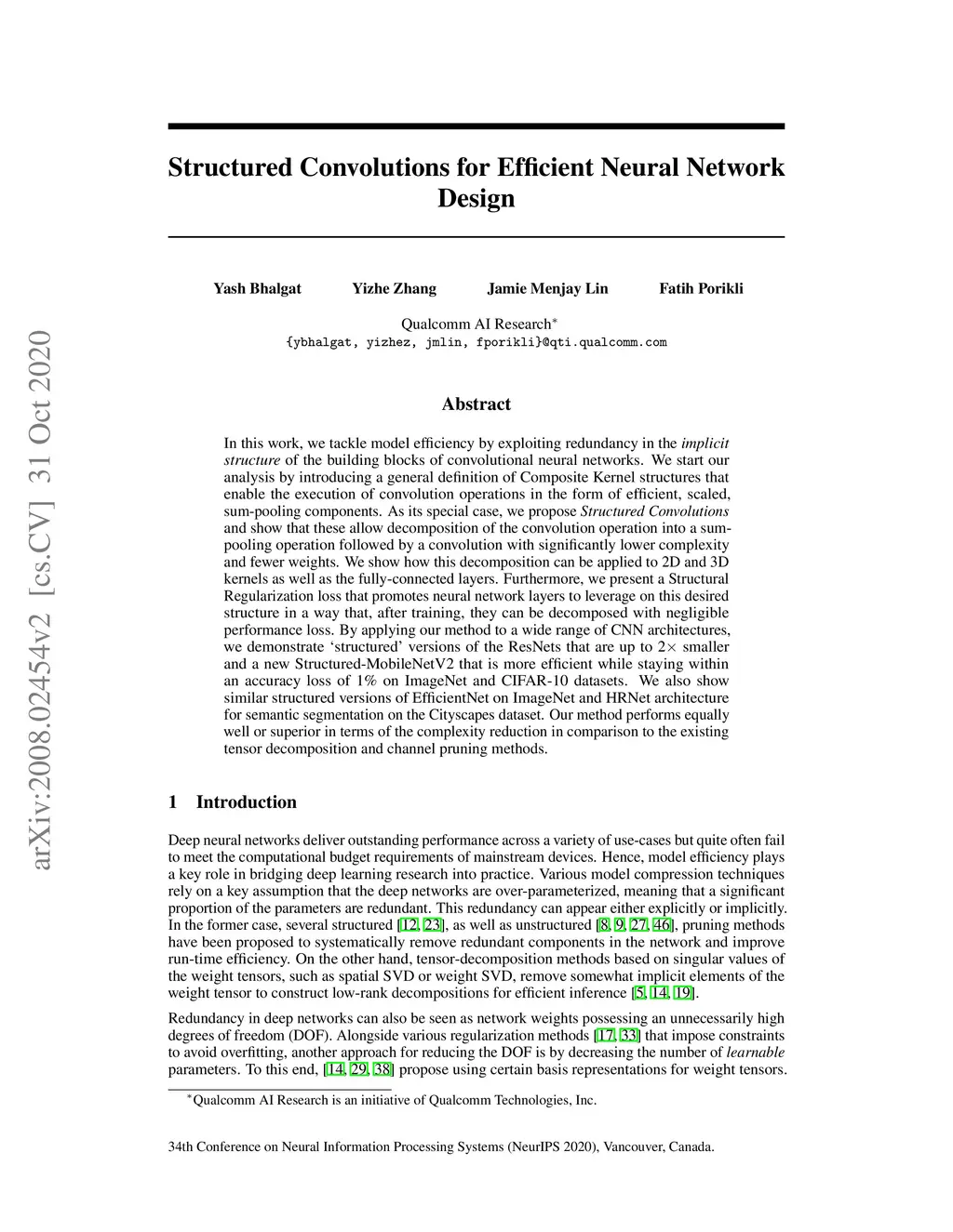 In this work, we tackle model efficiency by exploiting redundancy in the \textit{implicit structure} of the building blocks of convolutional neural networks. We start our analysis by introducing a general definition of Composite Kernel structures that enable the execution of convolution operations in the form of efficient, scaled, sum-pooling components. As its special case, we propose \textit{Structured Convolutions} and show that these allow decomposition of the convolution operation into a sum-pooling operation followed by a convolution with significantly lower complexity and fewer weights. We show how this decomposition can be applied to 2D and 3D kernels as well as the fully-connected layers. Furthermore, we present a Structural Regularization loss that promotes neural network layers to leverage on this desired structure in a way that, after training, they can be decomposed with negligible performance loss. By applying our method to a wide range of CNN architectures, we demonstrate "structured" versions of the ResNets that are up to 2 smaller and a new Structured-MobileNetV2 that is more efficient while staying within an accuracy loss of 1% on ImageNet and CIFAR-10 datasets. We also show similar structured versions of EfficientNet on ImageNet and HRNet architecture for semantic segmentation on the Cityscapes dataset. Our method performs equally well or superior in terms of the complexity reduction in comparison to the existing tensor decomposition and channel pruning methods.