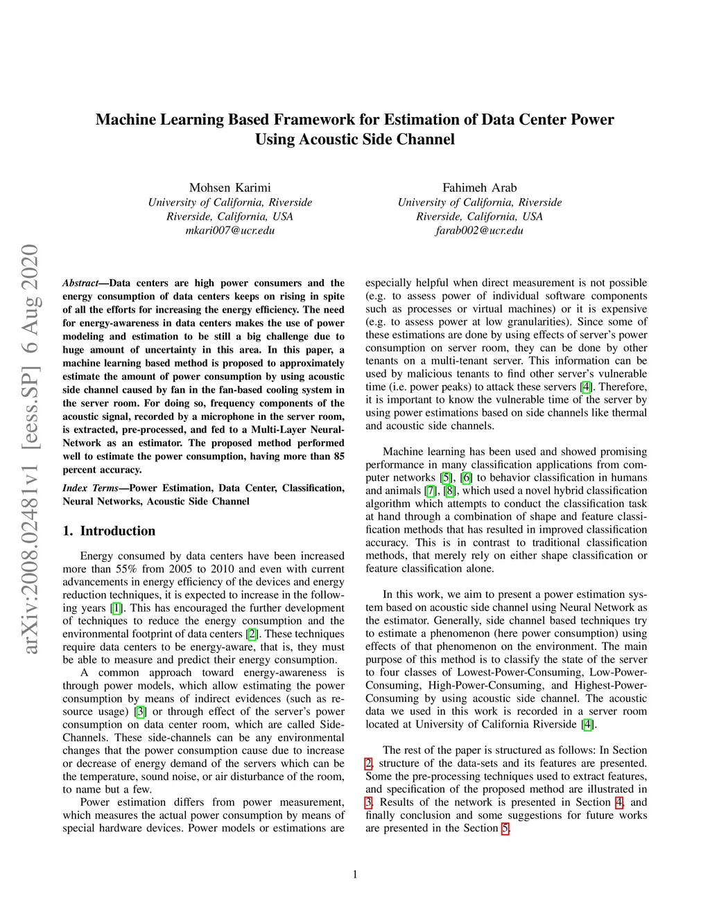 Data centers are high power consumers and the energy consumption of data centers keeps on rising in spite of all the efforts for increasing the energy efficiency. The need for energy-awareness in data centers makes the use of power modeling and estimation to be still a big challenge due to huge amount of uncertainty in this area. In this paper, a machine learning based method is proposed to approximately estimate the amount of power consumption by using acoustic side channel caused by fan in the fan-based cooling system in the server room. For doing so, frequency components of the acoustic signal, recorded by a microphone in the server room, is extracted, pre-processed, and fed to a Multi-Layer Neural-Network as an estimator. The proposed method performed well to estimate the power consumption, having more than 85 percent accuracy.