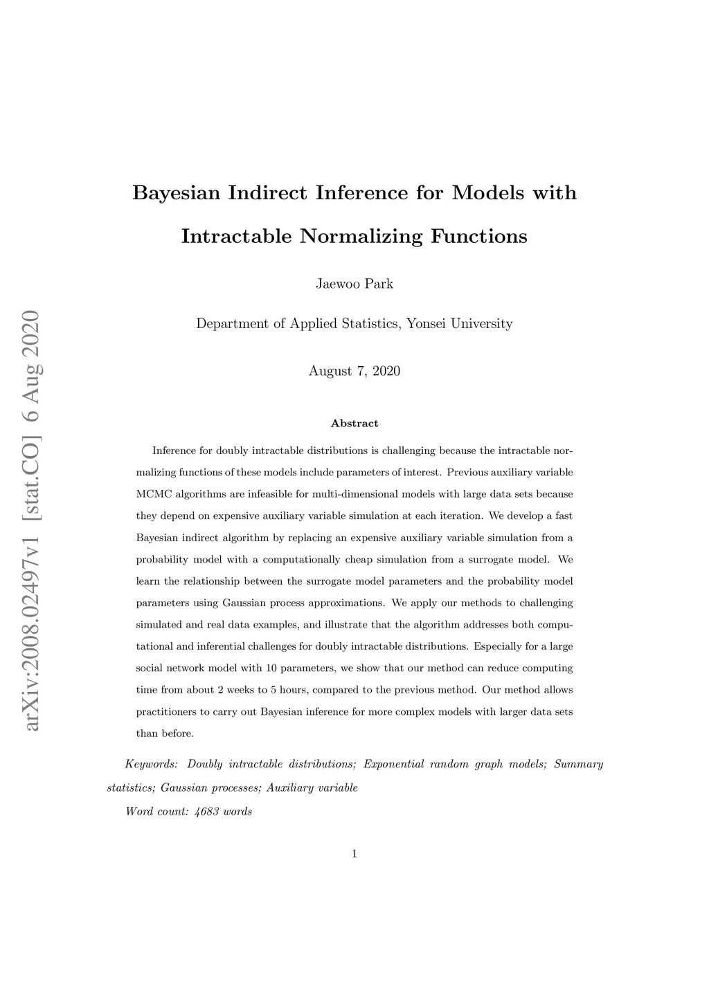 Inference for doubly intractable distributions is challenging because the intractable normalizing functions of these models include parameters of interest. Previous auxiliary variable MCMC algorithms are infeasible for multi-dimensional models with large data sets because they depend on expensive auxiliary variable simulation at each iteration. We develop a fast Bayesian indirect algorithm by replacing an expensive auxiliary variable simulation from a probability model with a computationally cheap simulation from a surrogate model. We learn the relationship between the surrogate model parameters and the probability model parameters using Gaussian process approximations. We apply our methods to challenging simulated and real data examples, and illustrate that the algorithm addresses both computational and inferential challenges for doubly intractable distributions. Especially for a large social network model with 10 parameters, we show that our method can reduce computing time from about 2 weeks to 5 hours, compared to the previous method. Our method allows practitioners to carry out Bayesian inference for more complex models with larger data sets than before.