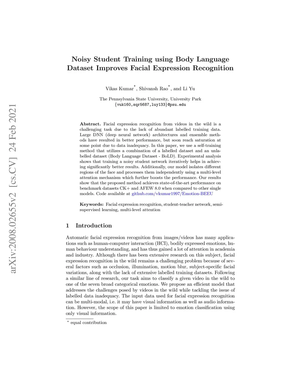 Facial expression recognition from videos in the wild is a challenging task due to the lack of abundant labelled training data. Large DNN (deep neural network) architectures and ensemble methods have resulted in better performance, but soon reach saturation at some point due to data inadequacy. In this paper, we use a self-training method that utilizes a combination of a labelled dataset and an unlabelled dataset (Body Language Dataset - BoLD). Experimental analysis shows that training a noisy student network iteratively helps in achieving significantly better results. Additionally, our model isolates different regions of the face and processes them independently using a multi-level attention mechanism which further boosts the performance. Our results show that the proposed method achieves state-of-the-art performance on benchmark datasets CK+ and AFEW 8.0 when compared to other single models.