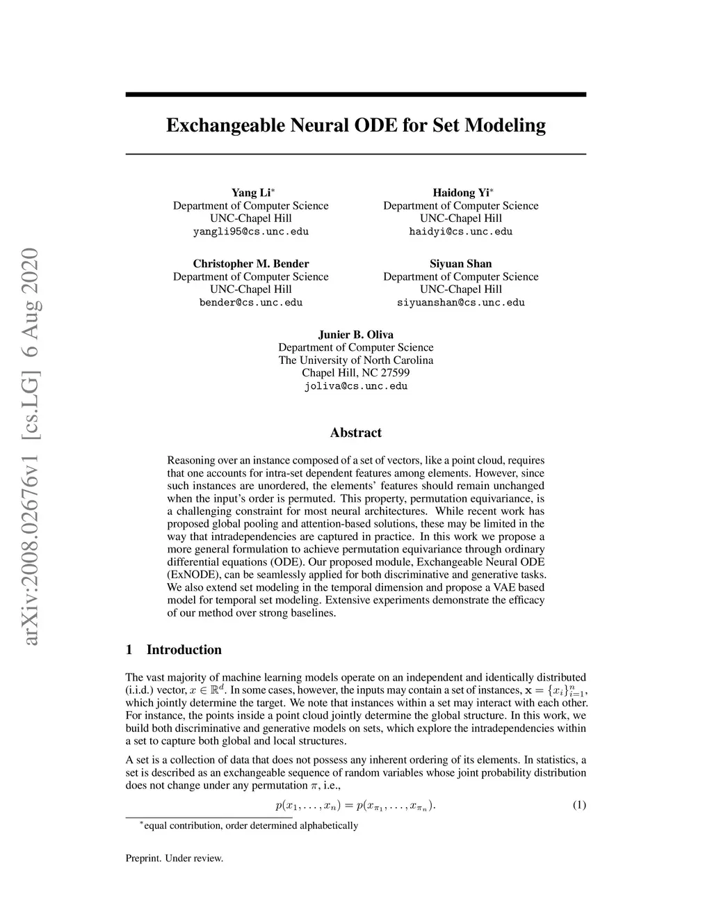 Reasoning over an instance composed of a set of vectors, like a point cloud, requires that one accounts for intra-set dependent features among elements. However, since such instances are unordered, the elements' features should remain unchanged when the input's order is permuted. This property, permutation equivariance, is a challenging constraint for most neural architectures. While recent work has proposed global pooling and attention-based solutions, these may be limited in the way that intradependencies are captured in practice. In this work we propose a more general formulation to achieve permutation equivariance through ordinary differential equations (ODE). Our proposed module, Exchangeable Neural ODE (ExNODE), can be seamlessly applied for both discriminative and generative tasks. We also extend set modeling in the temporal dimension and propose a VAE based model for temporal set modeling. Extensive experiments demonstrate the efficacy of our method over strong baselines.