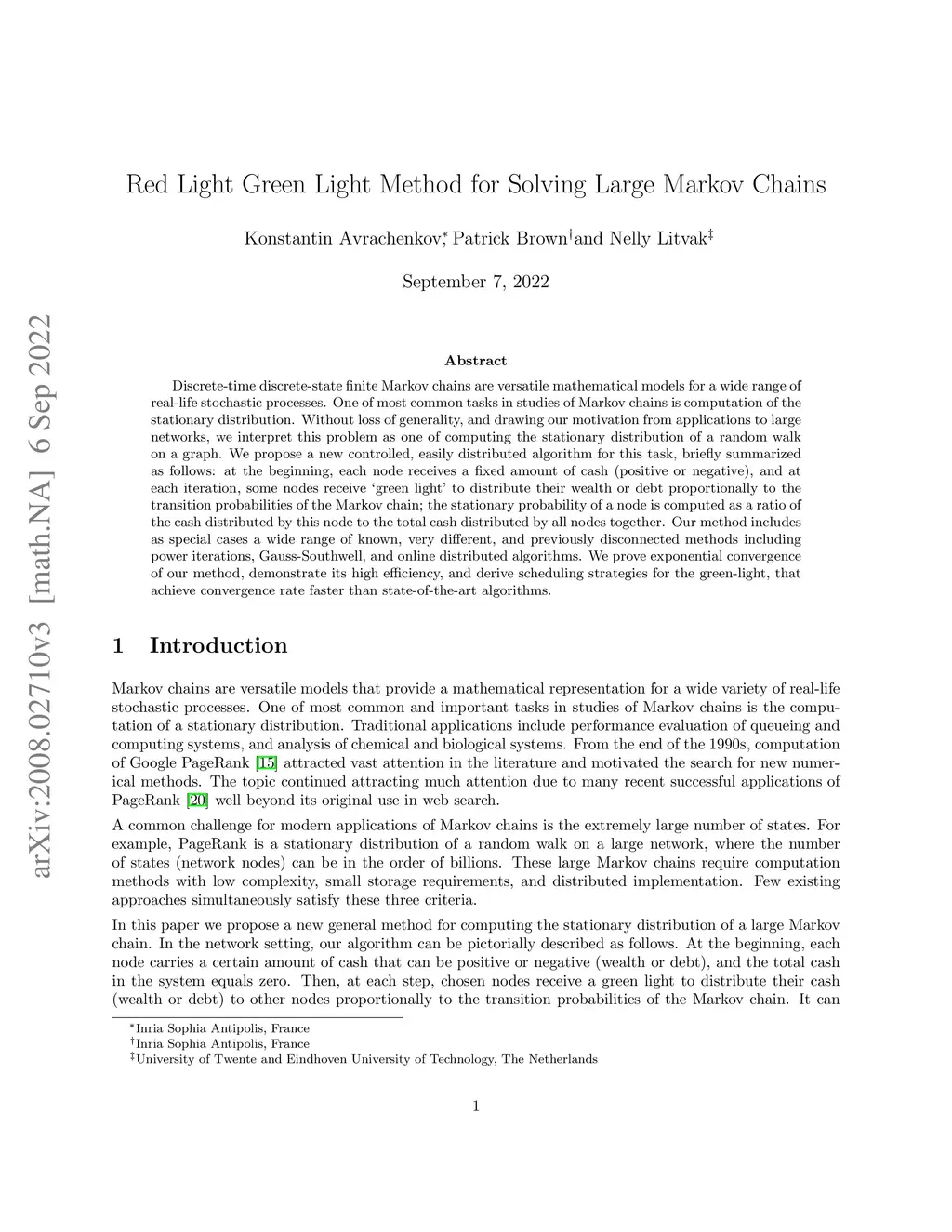 Discrete-time discrete-state finite Markov chains are versatile mathematical models for a wide range of real-life stochastic processes. One of most common tasks in studies of Markov chains is computation of the stationary distribution. Without loss of generality, and drawing our motivation from applications to large networks, we interpret this problem as one of computing the stationary distribution of a random walk on a graph. We propose a new controlled, easily distributed algorithm for this task, briefly summarized as follows: at the beginning, each node receives a fixed amount of cash (positive or negative), and at each iteration, some nodes receive `green light' to distribute their wealth or debt proportionally to the transition probabilities of the Markov chain; the stationary probability of a node is computed as a ratio of the cash distributed by this node to the total cash distributed by all nodes together. Our method includes as special cases a wide range of known, very different, and previously disconnected methods including power iterations, Gauss-Southwell, and online distributed algorithms. We prove exponential convergence of our method, demonstrate its high efficiency, and derive scheduling strategies for the green-light, that achieve convergence rate faster than state-of-the-art algorithms.