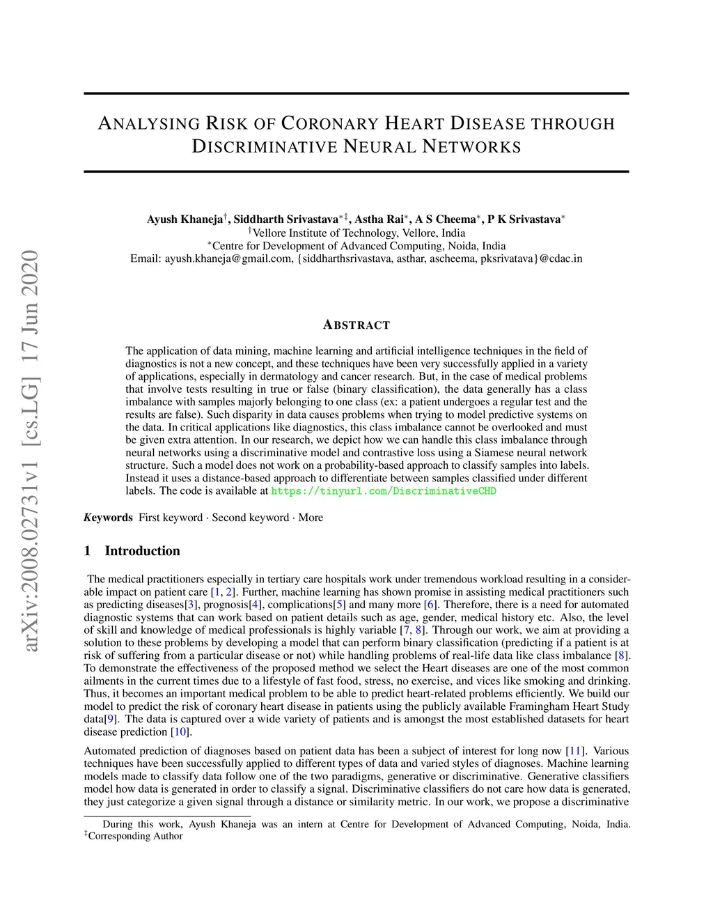 The application of data mining, machine learning and artificial intelligence techniques in the field of diagnostics is not a new concept, and these techniques have been very successfully applied in a variety of applications, especially in dermatology and cancer research. But, in the case of medical problems that involve tests resulting in true or false (binary classification), the data generally has a class imbalance with samples majorly belonging to one class (ex: a patient undergoes a regular test and the results are false). Such disparity in data causes problems when trying to model predictive systems on the data. In critical applications like diagnostics, this class imbalance cannot be overlooked and must be given extra attention. In our research, we depict how we can handle this class imbalance through neural networks using a discriminative model and contrastive loss using a Siamese neural network structure. Such a model does not work on a probability-based approach to classify samples into labels. Instead it uses a distance-based approach to differentiate between samples classified under different labels. The code is available at https://tinyurl.com/DiscriminativeCHD/