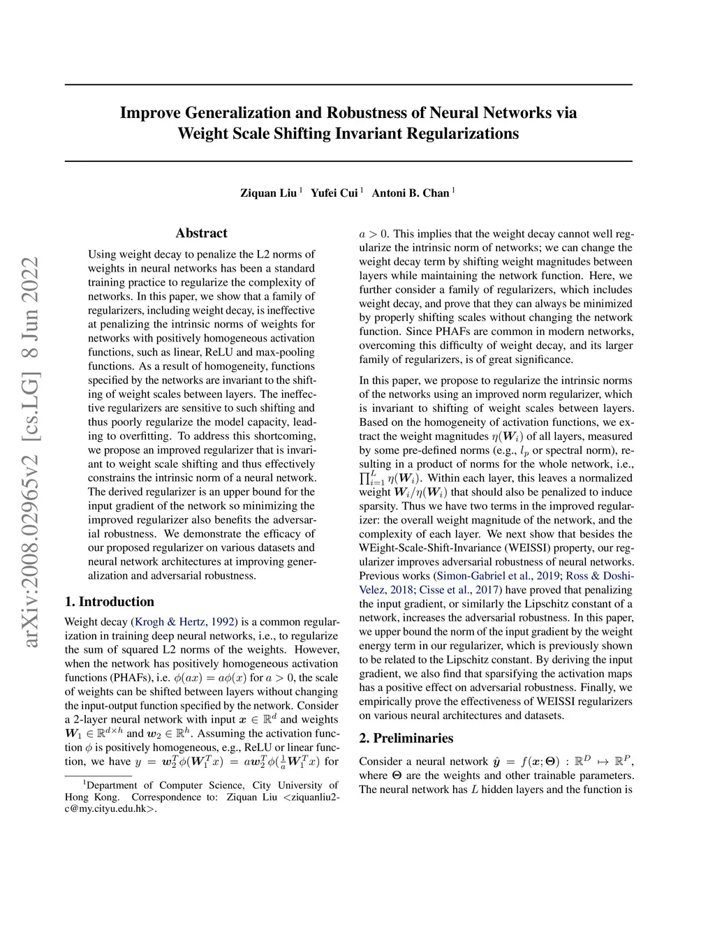 Using weight decay to penalize the L2 norms of weights in neural networks has been a standard training practice to regularize the complexity of networks. In this paper, we show that a family of regularizers, including weight decay, is ineffective at penalizing the intrinsic norms of weights for networks with positively homogeneous activation functions, such as linear, ReLU and max-pooling functions. As a result of homogeneity, functions specified by the networks are invariant to the shifting of weight scales between layers. The ineffective regularizers are sensitive to such shifting and thus poorly regularize the model capacity, leading to overfitting. To address this shortcoming, we propose an improved regularizer that is invariant to weight scale shifting and thus effectively constrains the intrinsic norm of a neural network. The derived regularizer is an upper bound for the input gradient of the network so minimizing the improved regularizer also benefits the adversarial robustness. Residual connections are also considered and we show that our regularizer also forms an upper bound to input gradients of such a residual network. We demonstrate the efficacy of our proposed regularizer on various datasets and neural network architectures at improving generalization and adversarial robustness.