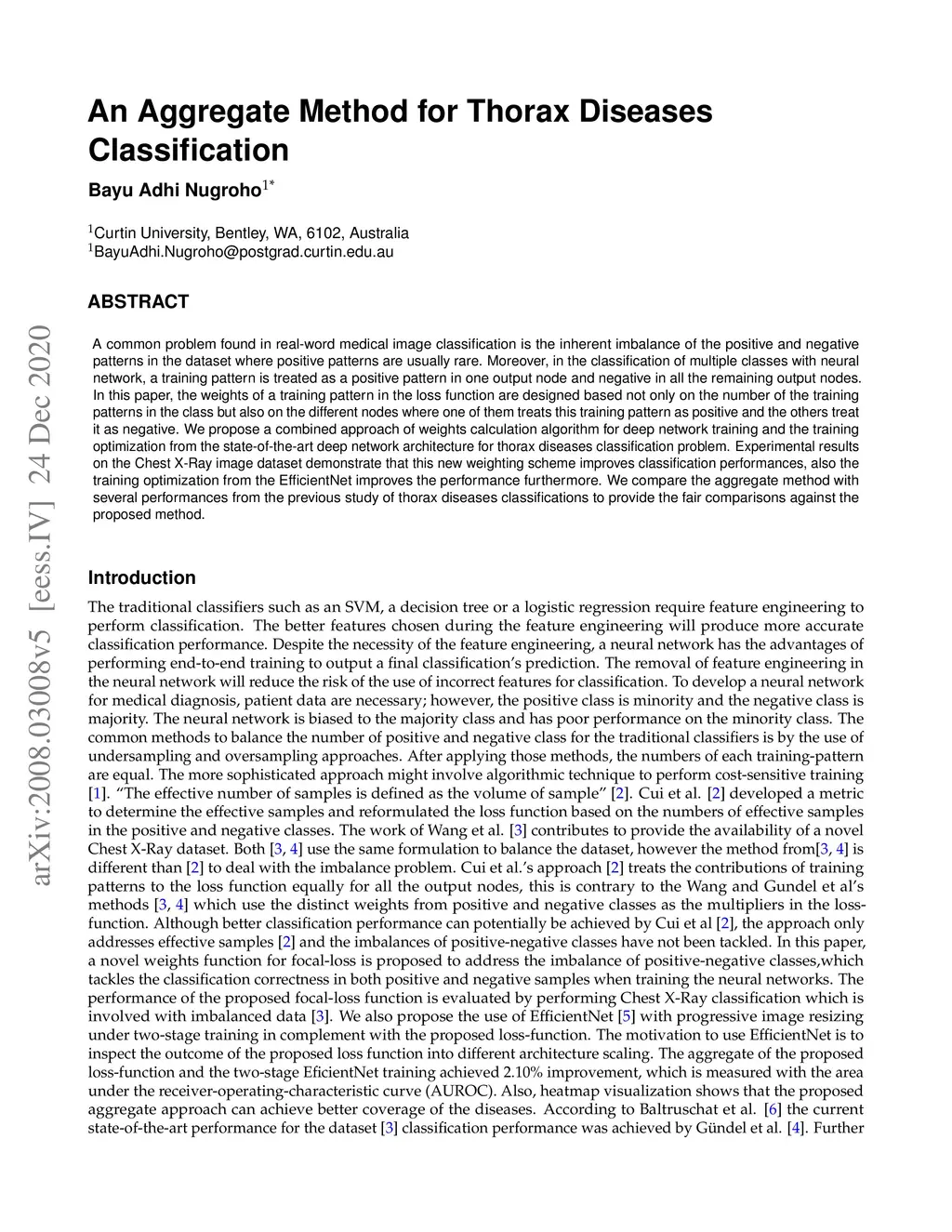 A common problem found in real-word medical image classification is the inherent imbalance of the positive and negative patterns in the dataset where positive patterns are usually rare. Moreover, in the classification of multiple classes with neural network, a training pattern is treated as a positive pattern in one output node and negative in all the remaining output nodes. In this paper, the weights of a training pattern in the loss function are designed based not only on the number of the training patterns in the class but also on the different nodes where one of them treats this training pattern as positive and the others treat it as negative. We propose a combined approach of weights calculation algorithm for deep network training and the training optimization from the state-of-the-art deep network architecture for thorax diseases classification problem. Experimental results on the Chest X-Ray image dataset demonstrate that this new weighting scheme improves classification performances, also the training optimization from the EfficientNet improves the performance furthermore. We compare the aggregate method with several performances from the previous study of thorax diseases classifications to provide the fair comparisons against the proposed method.