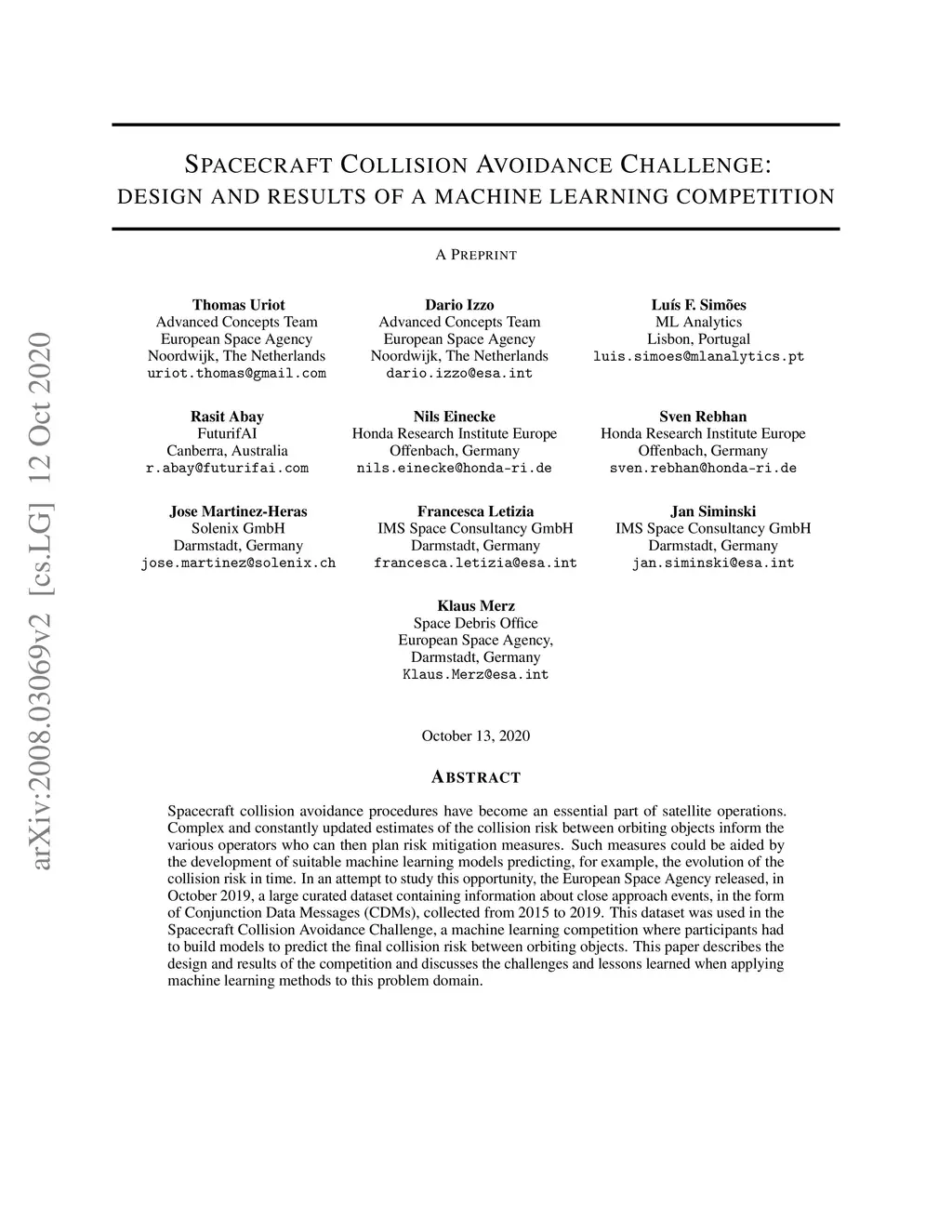 Spacecraft collision avoidance procedures have become an essential part of satellite operations. Complex and constantly updated estimates of the collision risk between orbiting objects inform the various operators who can then plan risk mitigation measures. Such measures could be aided by the development of suitable machine learning models predicting, for example, the evolution of the collision risk in time. In an attempt to study this opportunity, the European Space Agency released, in October 2019, a large curated dataset containing information about close approach events, in the form of Conjunction Data Messages (CDMs), collected from 2015 to 2019. This dataset was used in the Spacecraft Collision Avoidance Challenge, a machine learning competition where participants had to build models to predict the final collision risk between orbiting objects. This paper describes the design and results of the competition and discusses the challenges and lessons learned when applying machine learning methods to this problem domain.